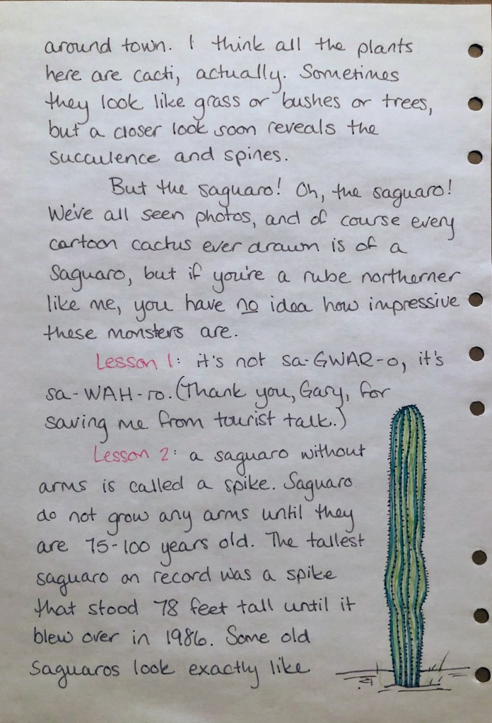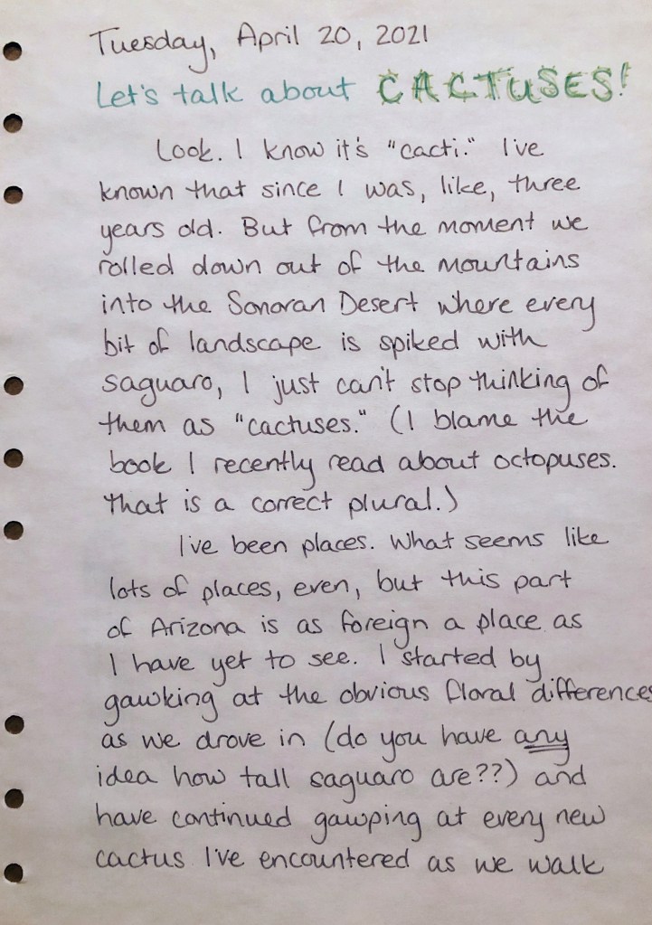 Look. I know it’s “cacti.” I’ve known that since I was, like, three years old. But from the moment we rolled down out of the mountains into the Sonoran Desert where every bit of landscape is spiked with saguaro, I just can’t stop thinking of them as “cactuses.” (I blame the book I recently read about octopuses. That is a correct plural.)