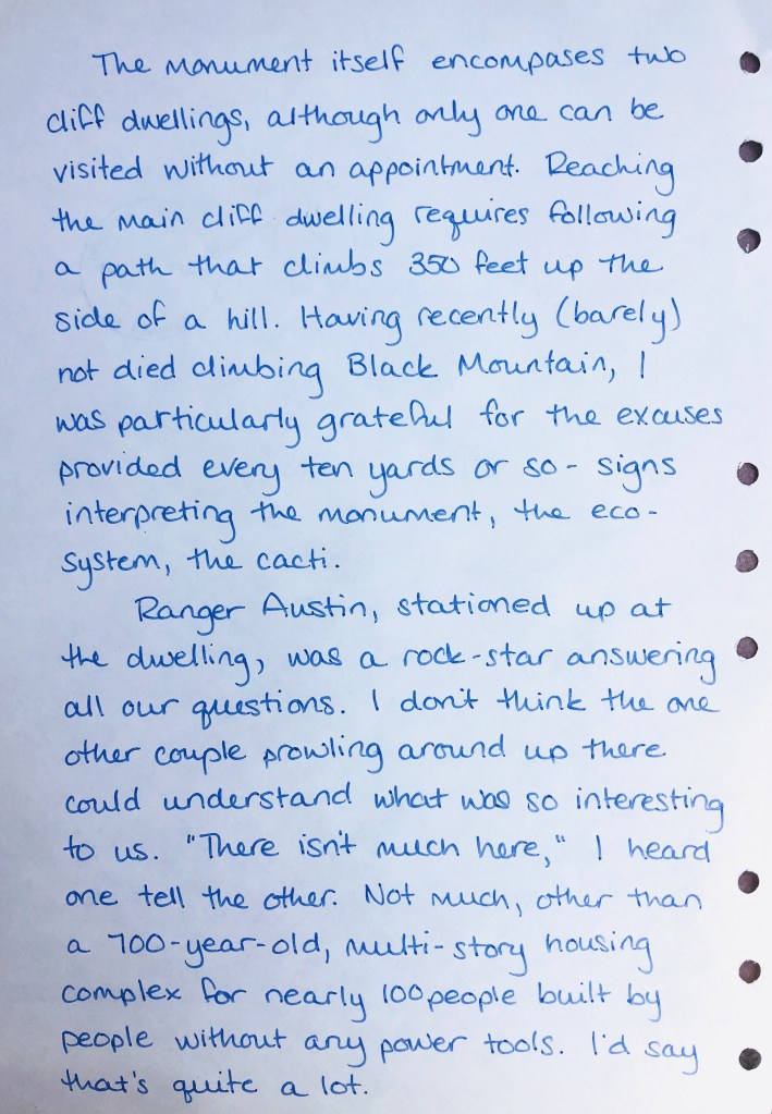 Ranger Austin, stationed up at the dwelling, was a rock-star answering all our questions. I don’t think the one other couple prowling around up there could understand what was so interesting to us. “There isn’t much here,” I heard one tell the other. Not much, other than a 700-year-old, multi-story housing complex for nearly 100 people built by people without any power tools. I’d say that’s quite a lot.