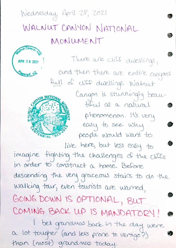 There are cliff dwellings, and then there are entire canyons full of cliff dwellings. Walnut Canyon is stunningly beautiful as a natural phenomenon. It’s very easy to see why people would want to live here, but less easy to imagine fighting the challenges of the cliffs in order to construct a home. Before descending the very gracious stairs to do the walking tour, even tourists are warned: