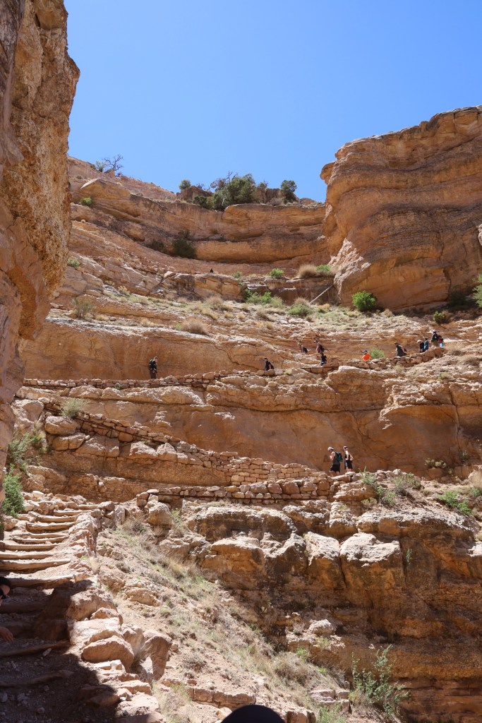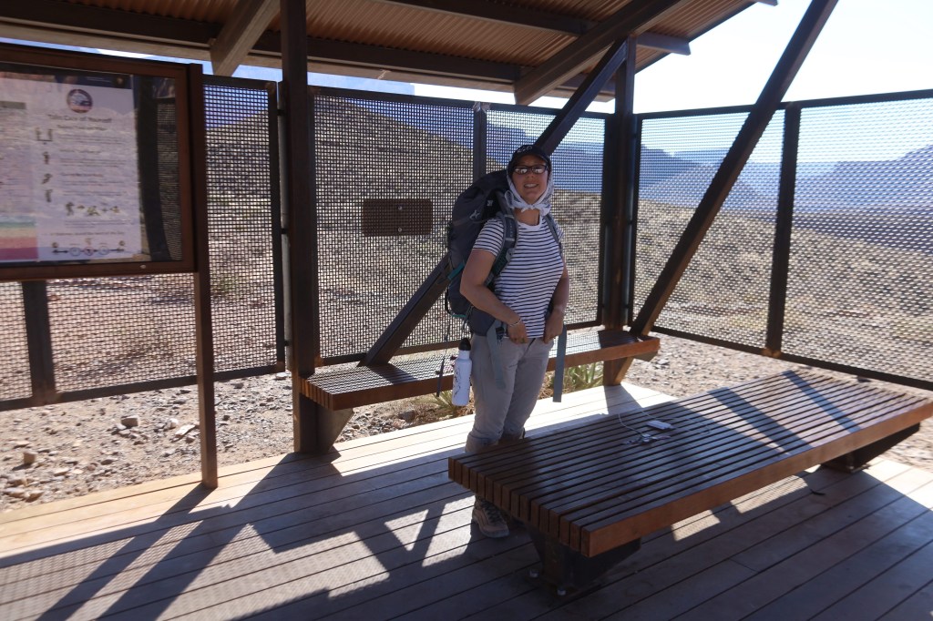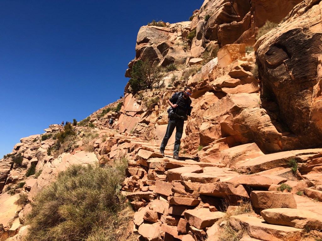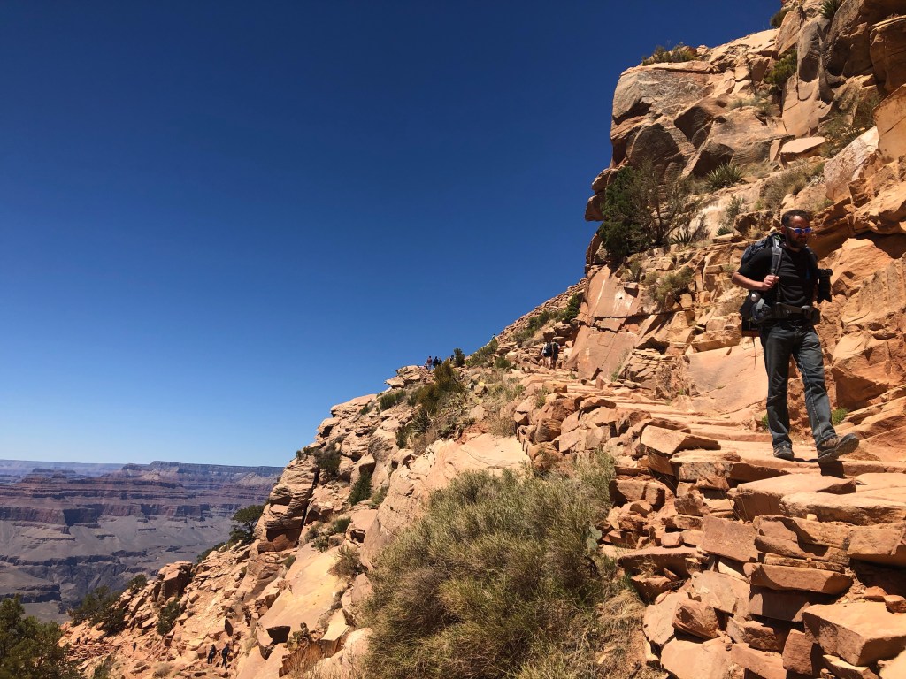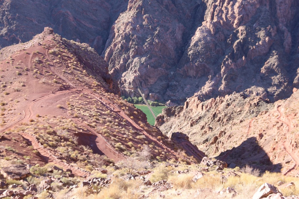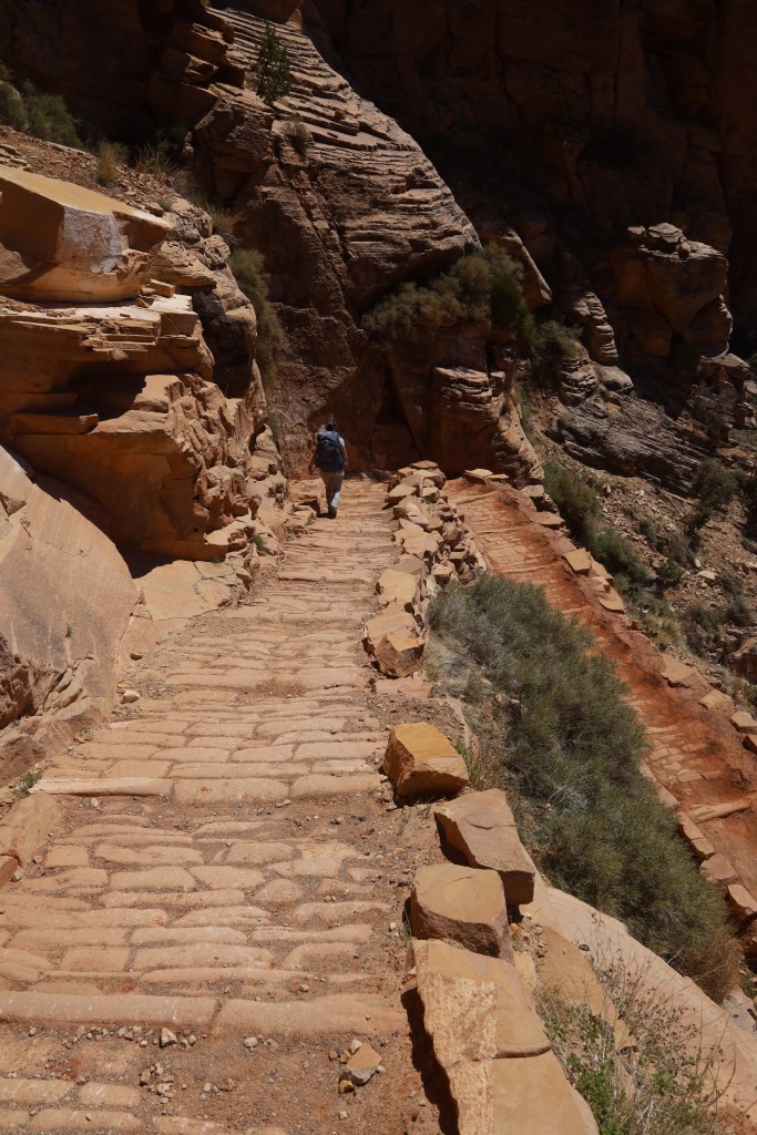 At the 4.5-mile resthouse (Tip Off), we encountered two groups of people who were not good at reading signs. The first pair had gotten to the bottom and were working their way back up. They looked done-in, but eventually moved out for many more hours of grueling up. Next we met a man on his own who’d made it to the bottom in 2 hours (insane!) but hadn’t seen any water [there] to drink and had run out. We gave him a liter of our water.