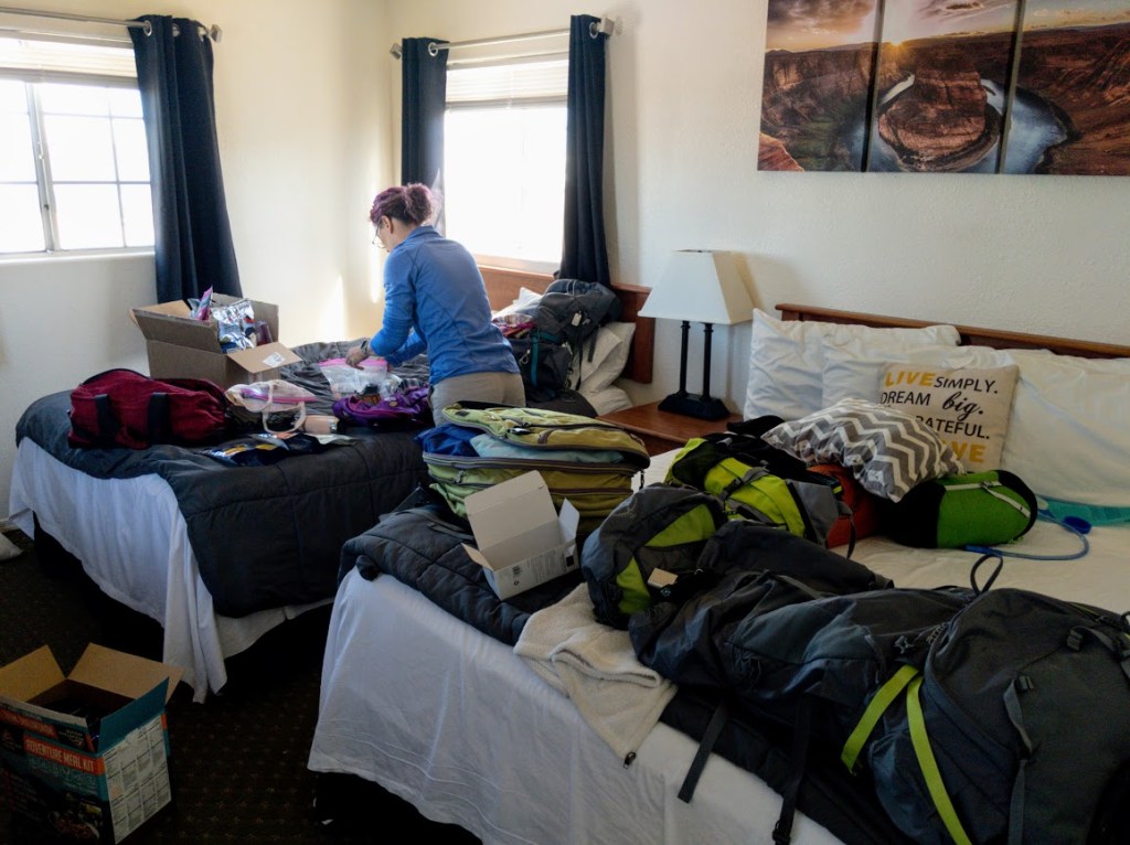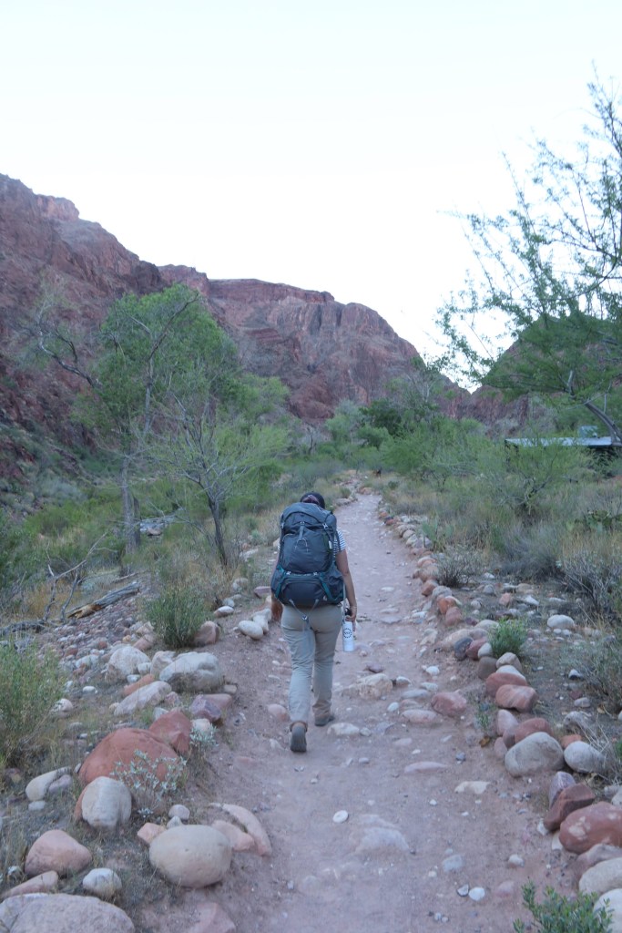 Okay. Now it is almost 9am. Advice on these big hikes is to start really early, but we were 40 minutes outside the park and in no way packed for an overnight trip. But remember that thing about how great I am at being prepared? Half an hour later our backpacks were stocked with overnight gear for 2 nights, meals for 2 days, and more water than you could shake a stick at. There is plenty of water at the bottom of the canyon, but at this time of year, not a drop to be found on the 7-mile hike down.