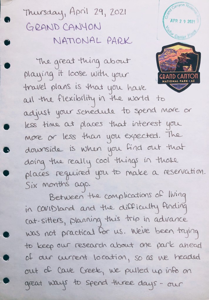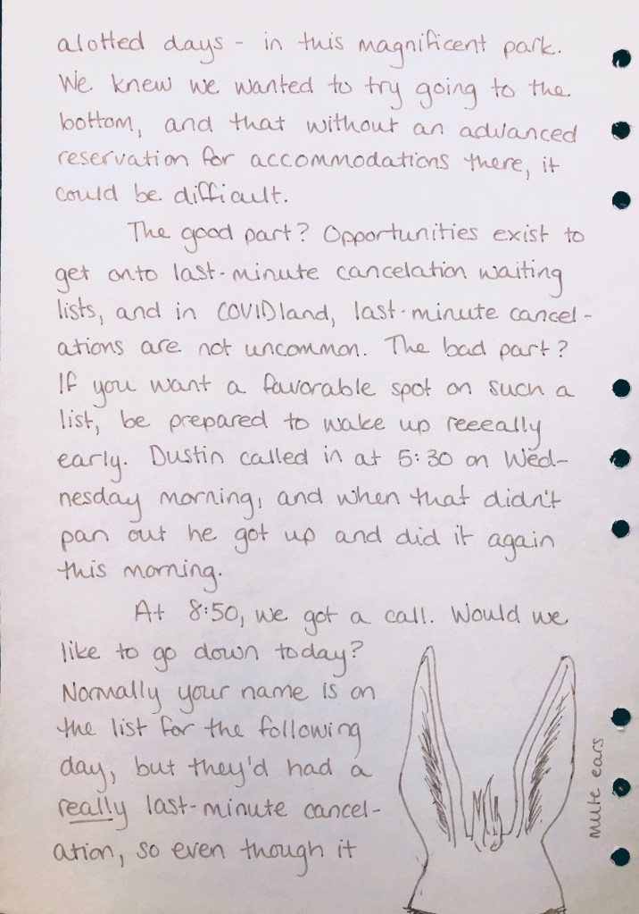 Between the complications of living in COVIDland and the difficulty finding cat-sitters, planning this trip in advance was not practical for us. We’ve been trying to keep our research about one park ahead of our current location, so as we headed out of Cave Creek, we pulled up info on great ways to spend our three days allotted days in this magnificent park. We knew we wanted to try going to the bottom, and that without an advanced reservation for accommodations there, it could be difficult.