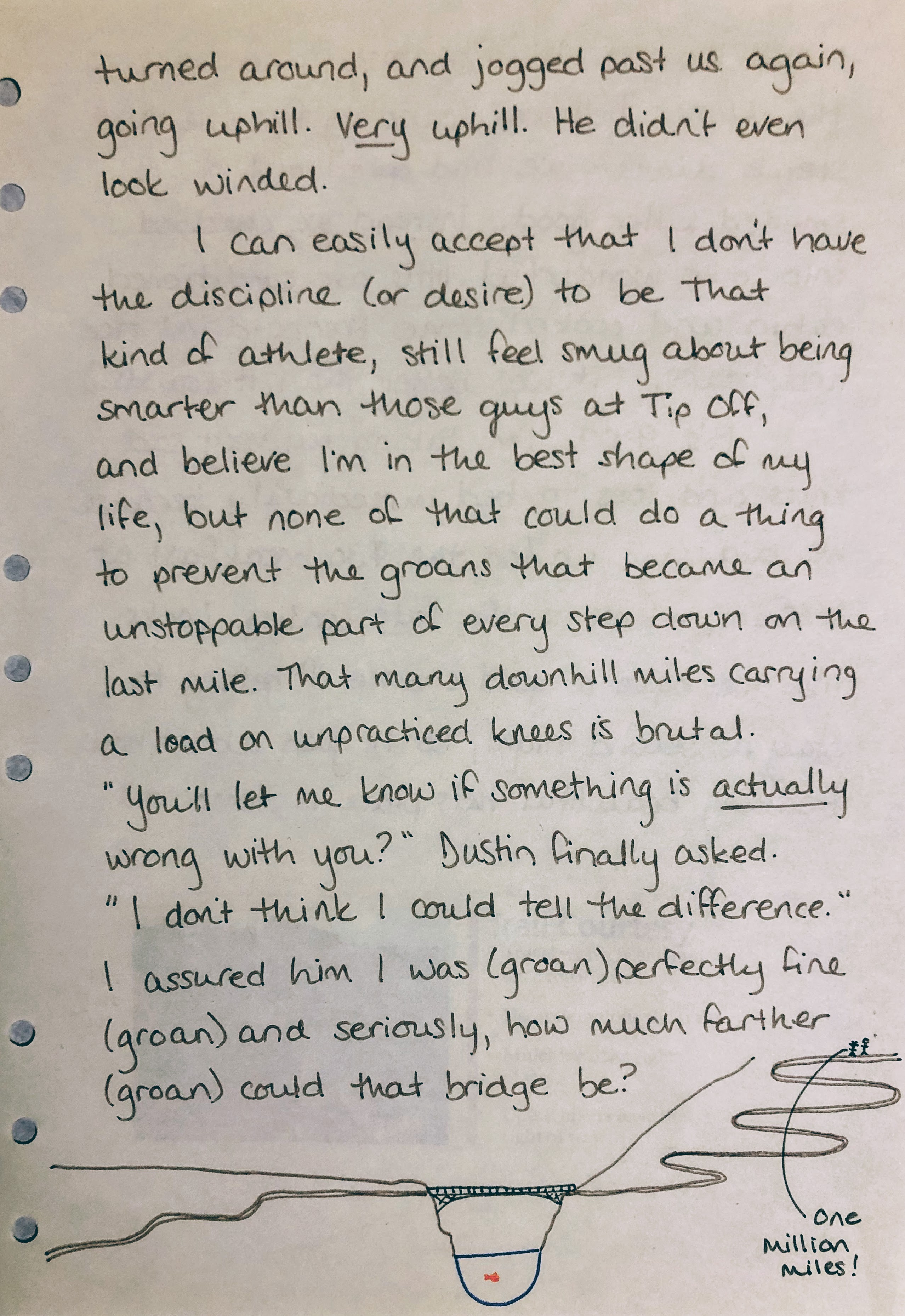I assured him I was (groan) perfectly fine (groan) and seriously, how much farther (groan) could that bridge be?