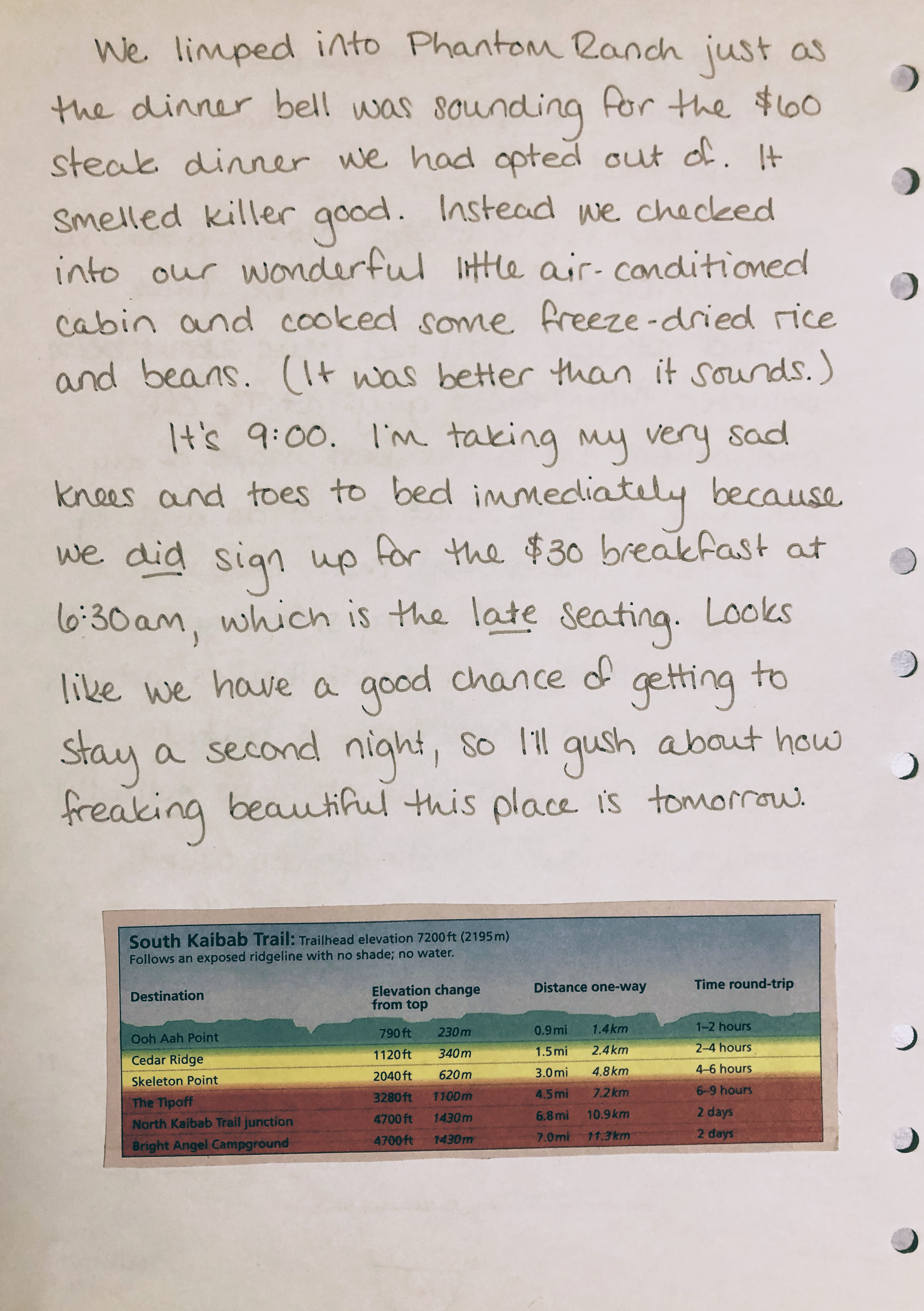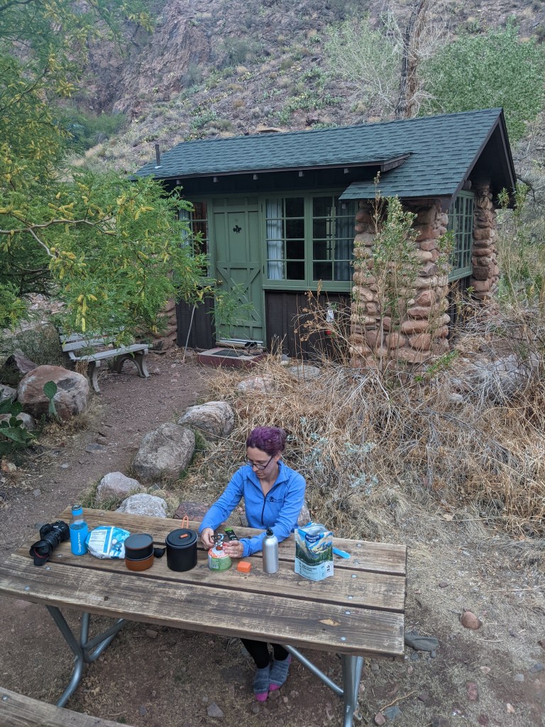 We (I) limped into Phantom Ranch just as the dinner bell was sounding for the $60 steak dinner we had opted out of. It smelled killer good. Instead we checked into our wonderful little air-conditioned cabin and cooked some freeze-dried rice and beans. (It was better than it sounds.)