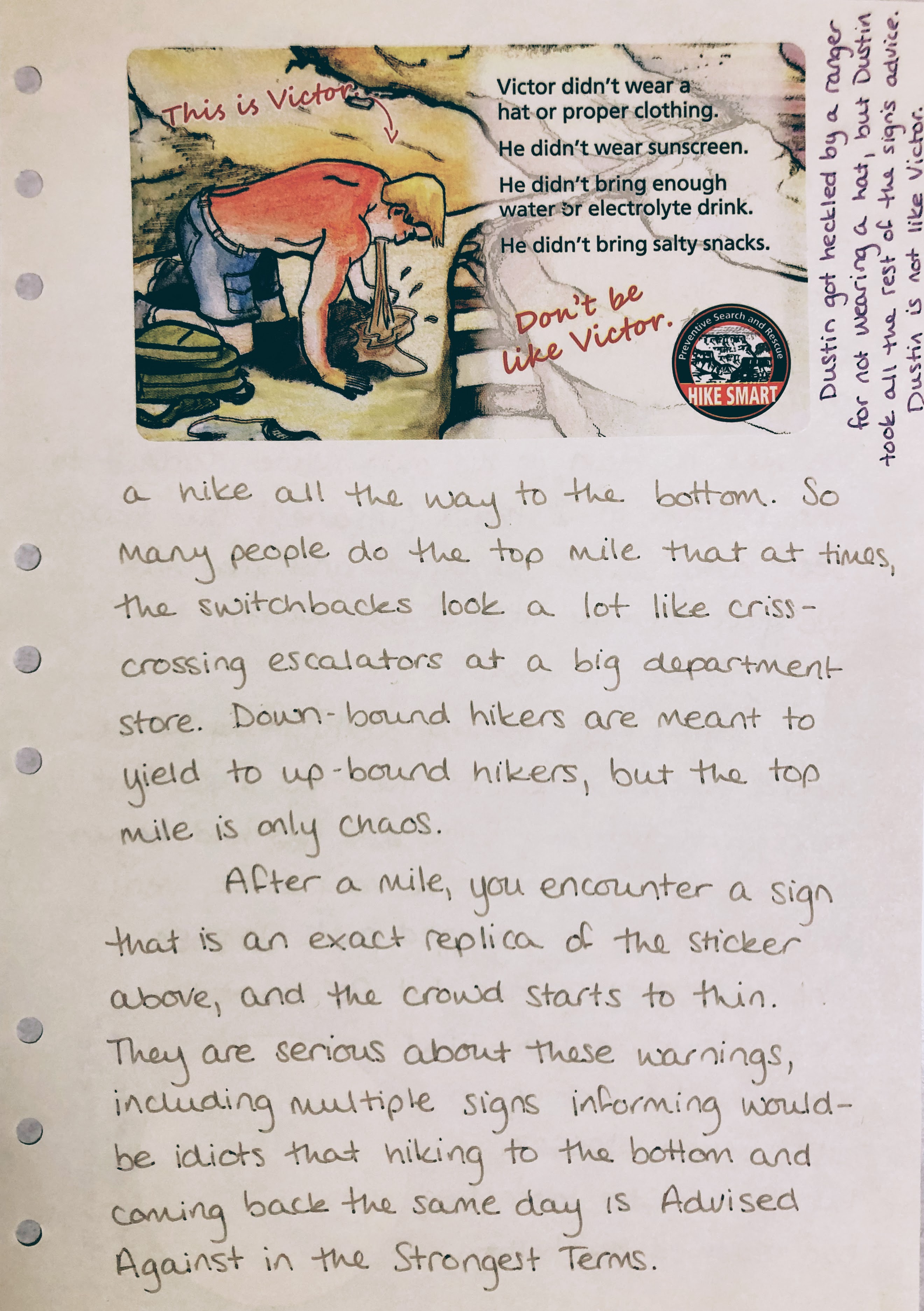 After a mile, you encounter a sign that is an exact replica of the sticker above, and the crowd starts to thin. They are serious about these warnings, including multiple signs informing would-be idiots that hiking to the bottom and coming back the same day is Advised Against in the Strongest Terms.