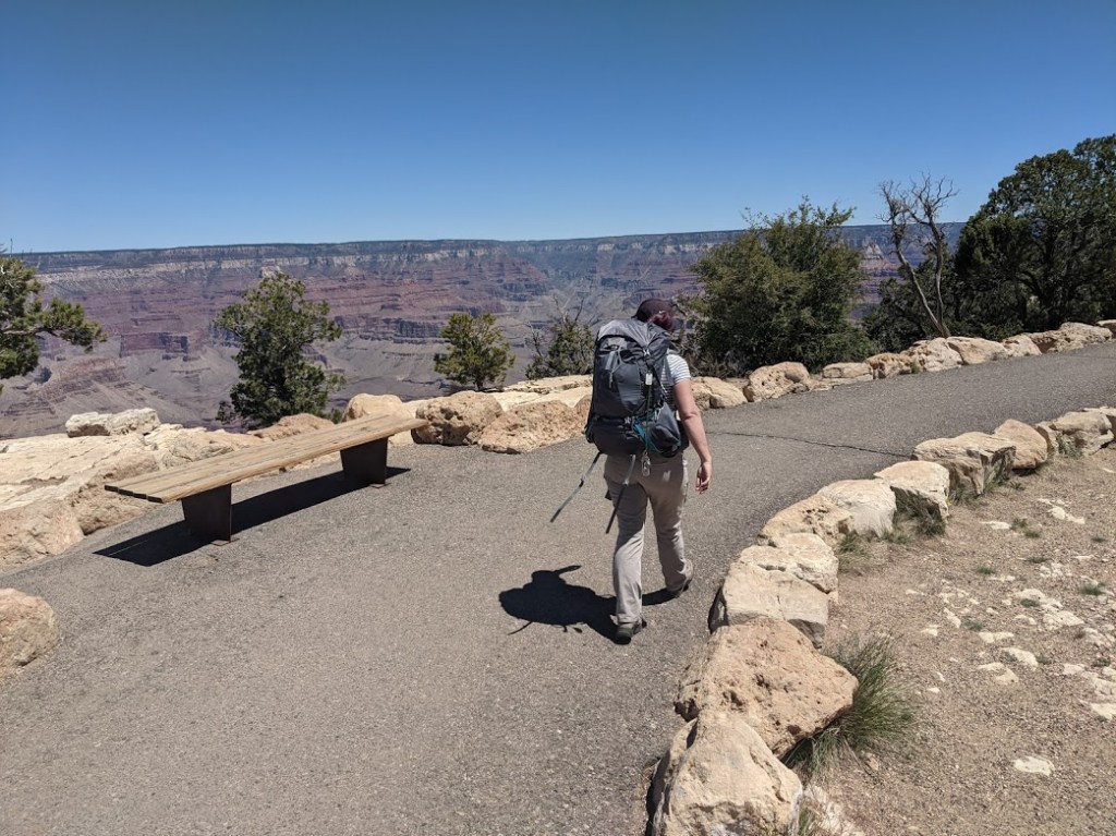Or… make that a 10-mile hike down. With our late notice, we’d missed the last shuttle taking hikers from the Bright Angel trailhead (our intended return route) to the South Kaibab trailhead. We would have to walk to the visitor’s center along the Rim Trail if we wanted our car to be waiting for us when we came back.