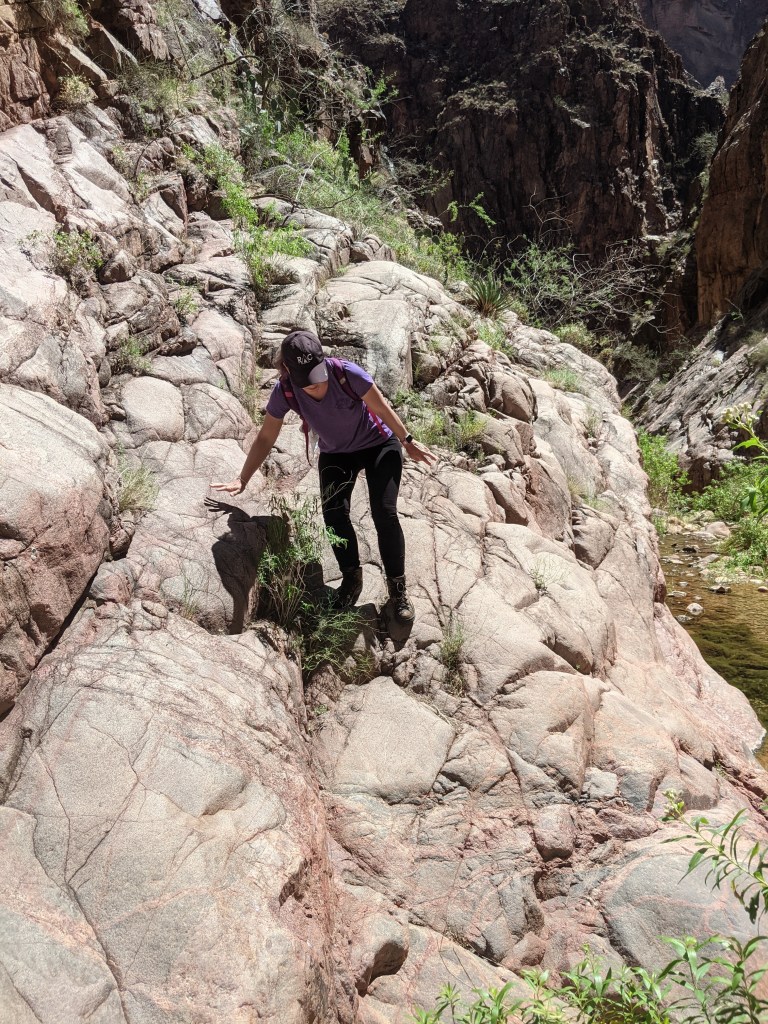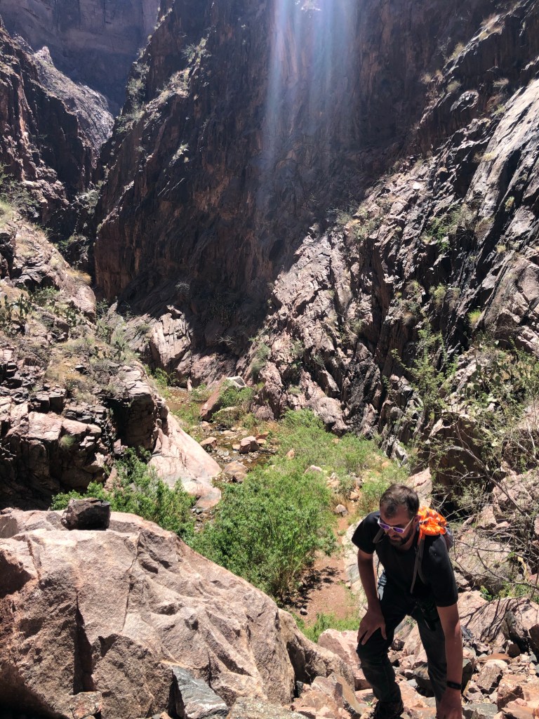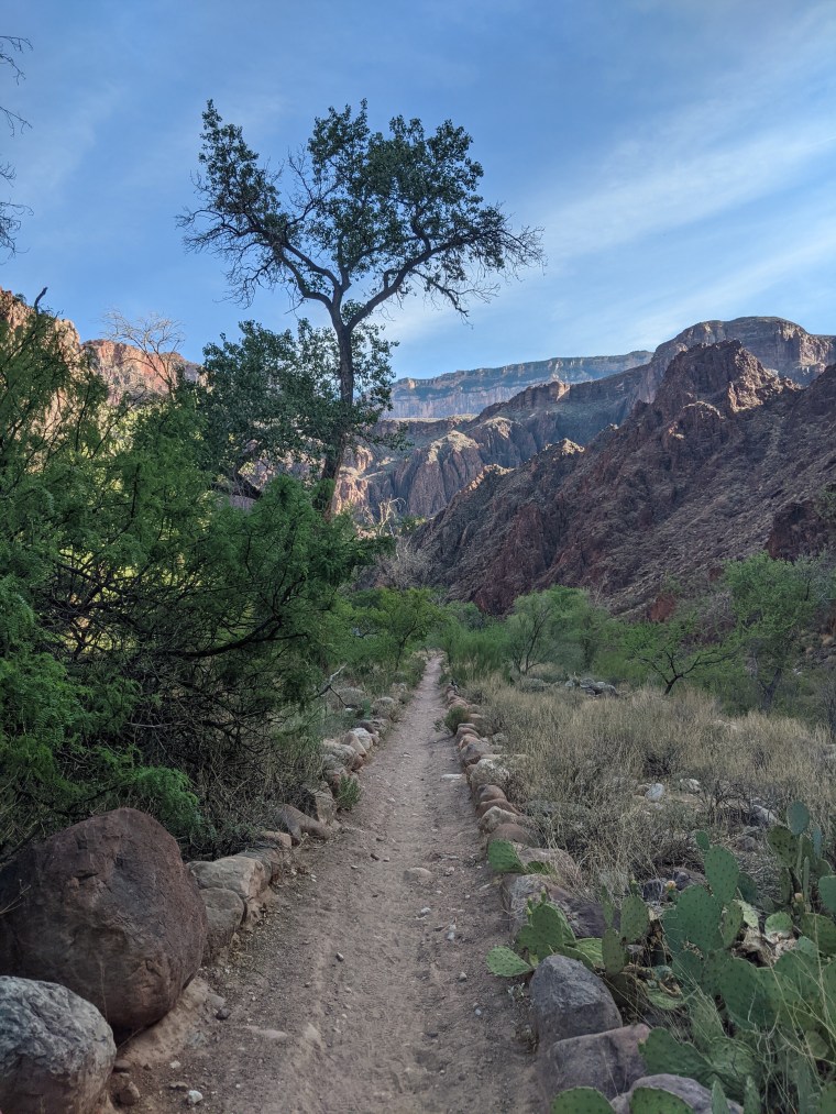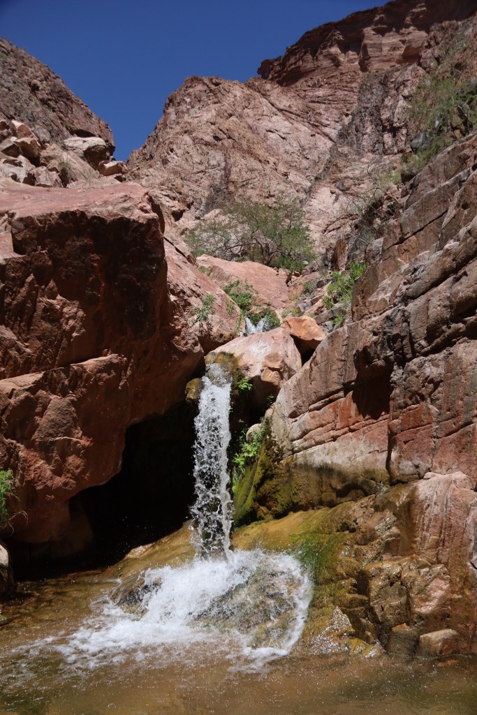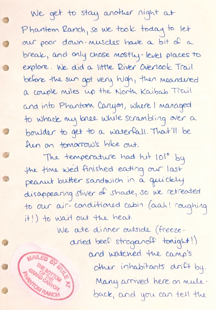 We get to stay another night at Phantom Ranch, so we took today to let our poor muscles have a bit of a break, and only chose mostly-level places to explore. We did a little River Overlook Trail before the sun got very high, then meandered a couple miles up the North Kaibab Trail and into Phantom Canyon, where I managed to whack my knee while scrambling over a boulder to get to a waterfall. That’ll be fun on tomorrow’s hike out.