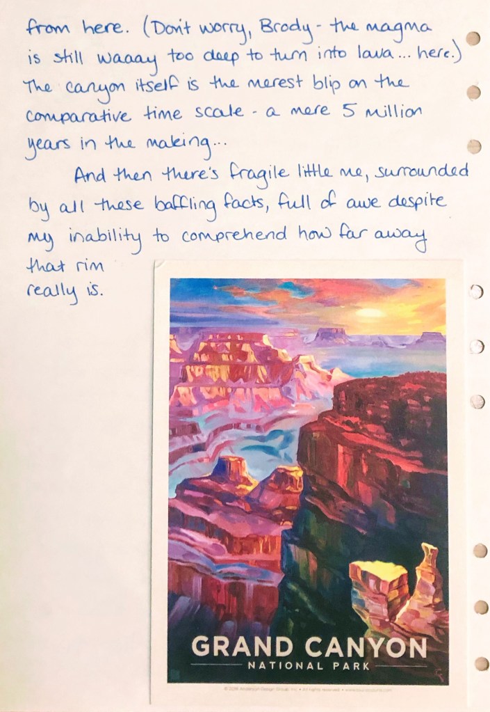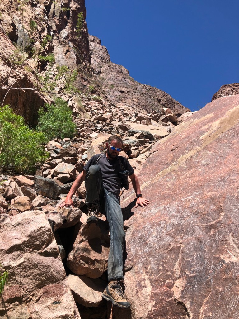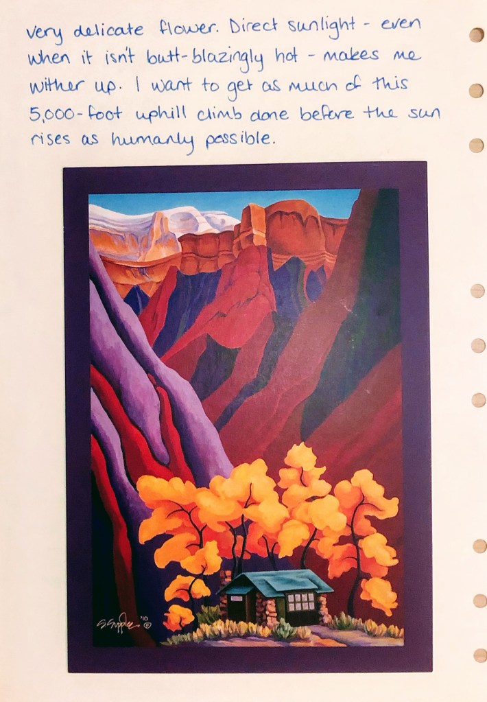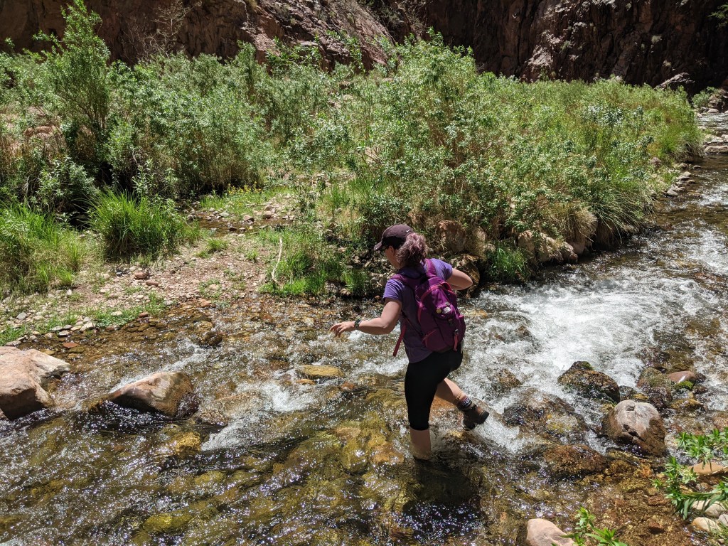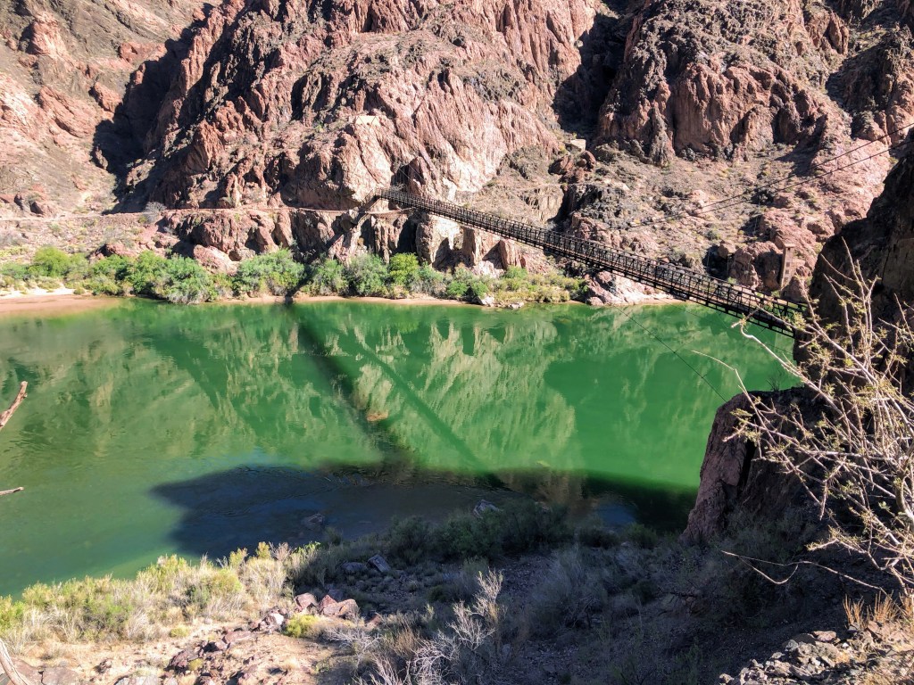 We get to stay another night at Phantom Ranch, so we took today to let our poor muscles have a bit of a break, and only chose mostly-level places to explore. We did a little River Overlook Trail before the sun got very high, then meandered a couple miles up the North Kaibab Trail and into Phantom Canyon, where I managed to whack my knee while scrambling over a boulder to get to a waterfall. That’ll be fun on tomorrow’s hike out.