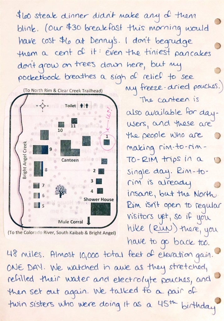 The canteen is also available for day users, and these are the people who are making rim-to-rim-TO-RIM trips in a single day. Rim-to-rim is already insane, but the North Rim isn’t open to regular visitors yet, so if you want to hike (RUN) there, you have to go back, too. 48 miles. Almost 10,000 total feet of elevation gain. IN ONE DAY. We watched in awe as they stretched, refilled their water and electrolyte pouches, and then set out again. We talked to a pair of twin sisters who were doing it as a 45th birthday celebration. After going down one side, up the other, and back down again, they seemed to be in much better shape than I was a full day after just going down. These are a different type of human being than I.