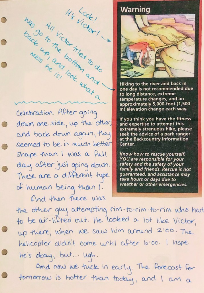 And then there was the other guy attempting rim-to-rim-to-rim who had to be air-lifted out. He looked a lot like Victor, up there, when we saw him around 2:00. The helicopter didn’t come until after 6:00. I hope he’s okay, but… ugh.