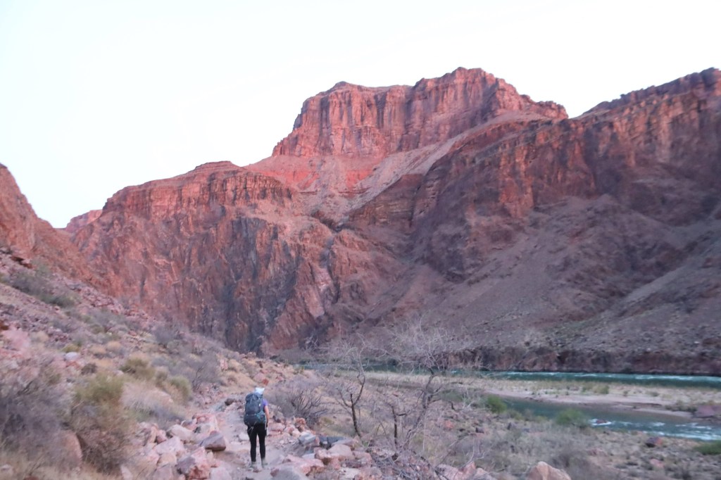 We were on the trail by 4:45, lighting our way with cell phones because we’ve never had occasion to equip for hiking in the dark. After the first mile, the sky had lightened enough to ditch the phone lights. The river was so beautiful in the pre-dawn light.