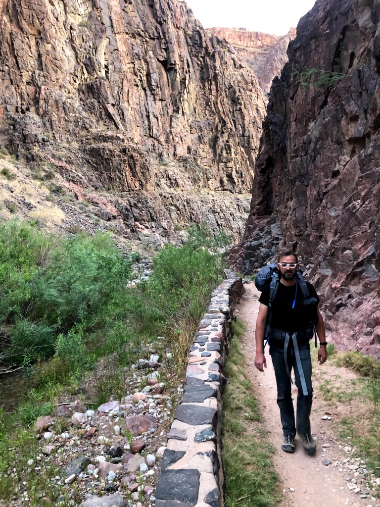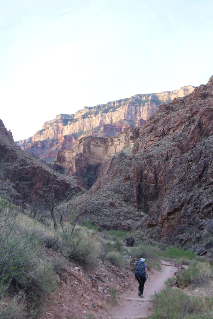 We made rockin’ progress for the first 5 miles, at about which point the sun finally appeared above the rim and the trail finally started making serious upward progress. We plugged along, and I kept myself motivated by promising at each mile that I only had to do one more, and that when we got to the Indian Gardens Campground, we would have a real break