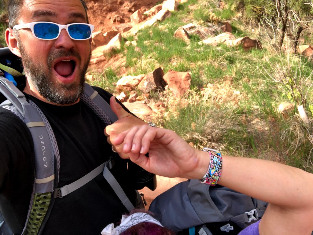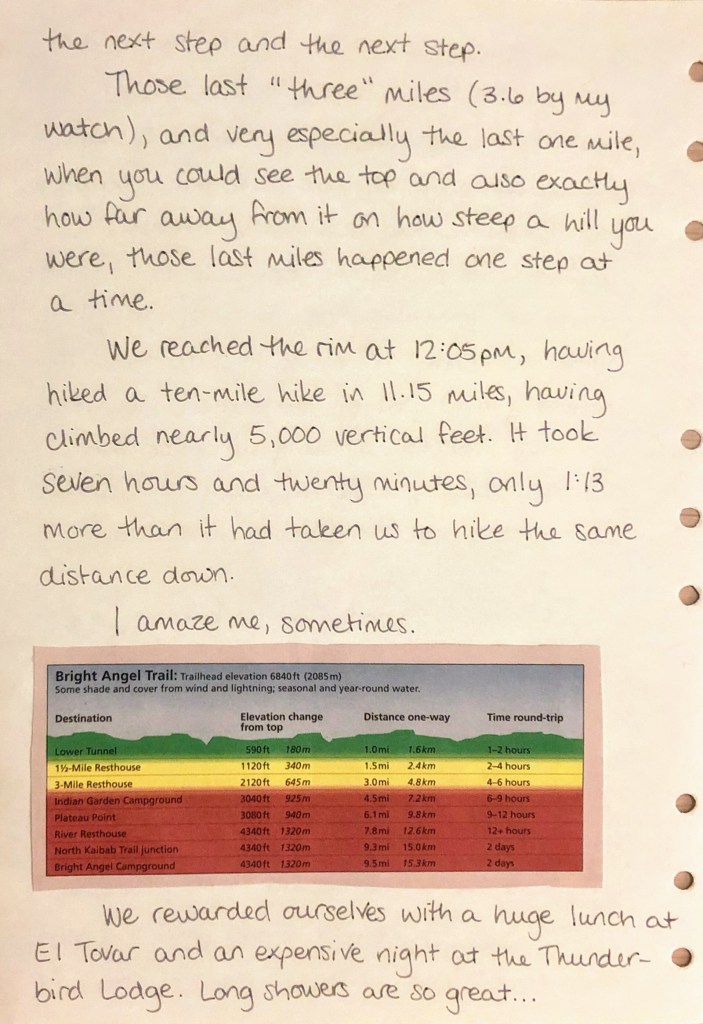 We reached the rim at 12:05pm, having hiked a ten-mile hike in 11.15 miles, having climbed nearly 5,000 vertical feet. It took seven hours and twenty minutes, only one hour and 13 minutes more than it had taken us to hike the same distance down.