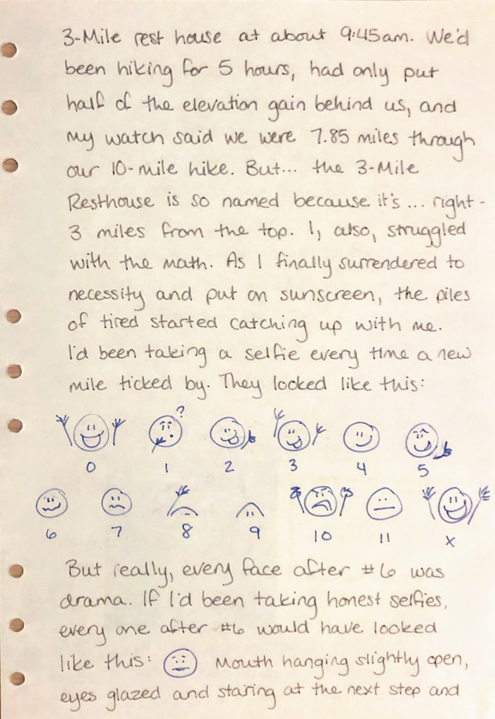 In fact, I continued to be damned impressed with myself all the way up to the 3-Mile rest house at about 9:45am. We’d been hiking for 5 hours, had only put half of the elevation gain behind us, and My watch said we were 7.85 miles our 10-mile hike. But… the 3-Mile through Resthouse is so named because it’s … right 3 miles from the top. I, also, struggled with the math. As I finally surrendered to necessity and put on sunscreen, the piles of tired started catching up with me. I’d been taking a selfie every time a new mile ticked by. They looked like this: