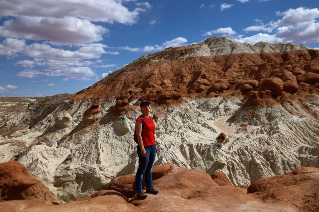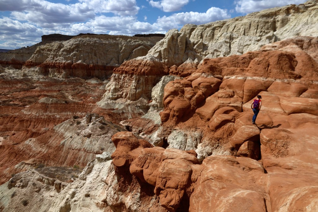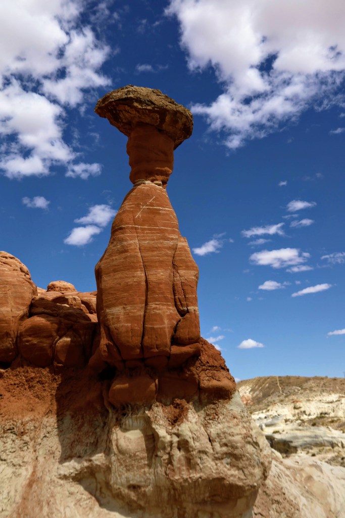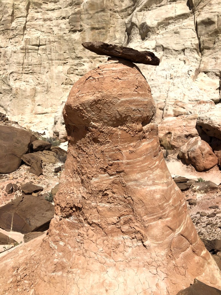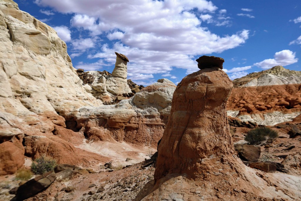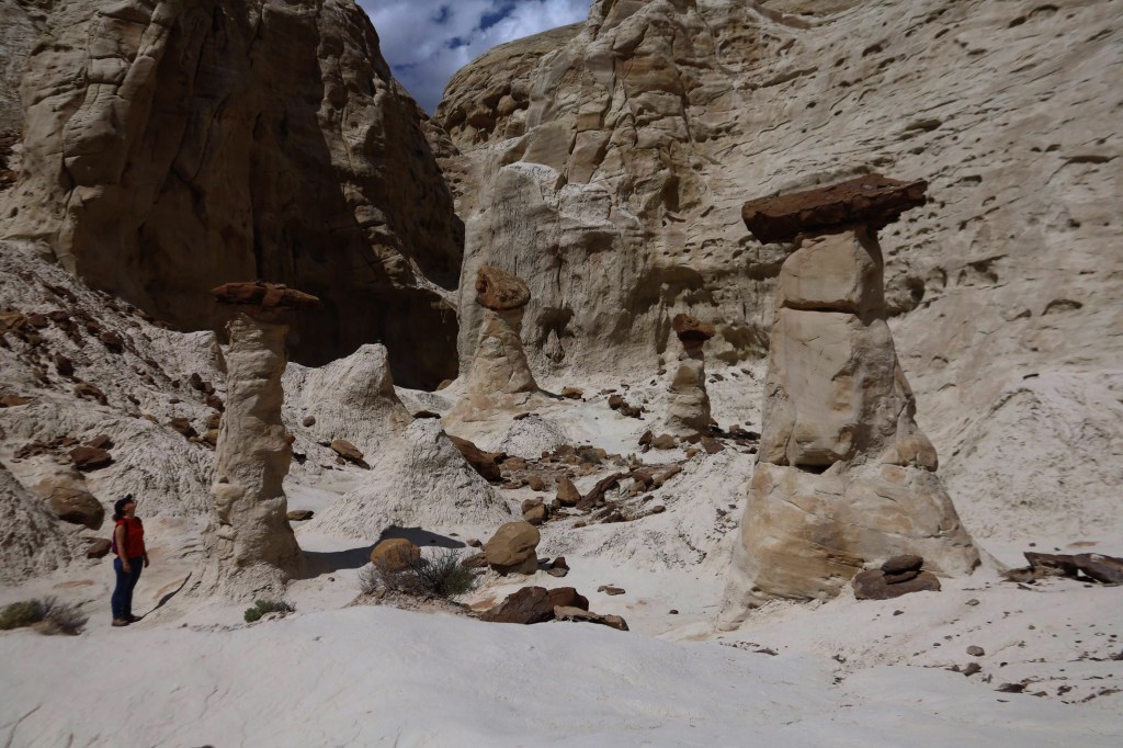 Having mostly recovered, we headed over toward Ground Staircase-Escalate NM to do low-key hike on the Toadstools Trail. “Toadstools” are what happens when a hard rock (around here, often dolomite) falls on a soft rock, which weathers away everywhere except directly beneath the hard stone, leaving it sitting like a hat on a column of dirt. The conditions were just right for their formation here, and they’re everywhere – some towering dozens of feet tall.