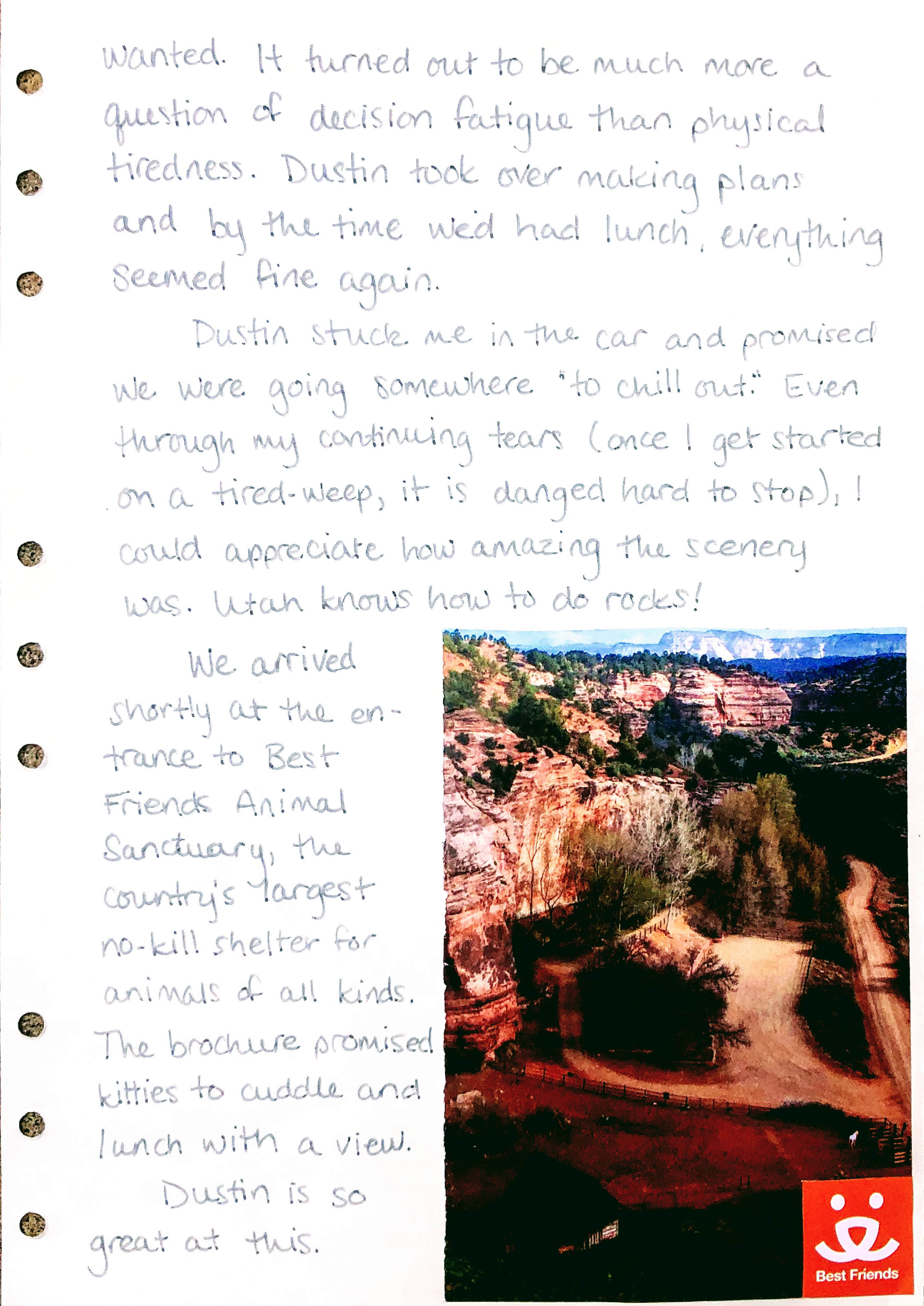 We arrived shortly at the entrance to Best Friends Animal Sanctuary, the country’s largest no-kill shelter for animals of all kinds. The brochure promised kitties to cuddle and lunch with a view. Dustin is so great at this.