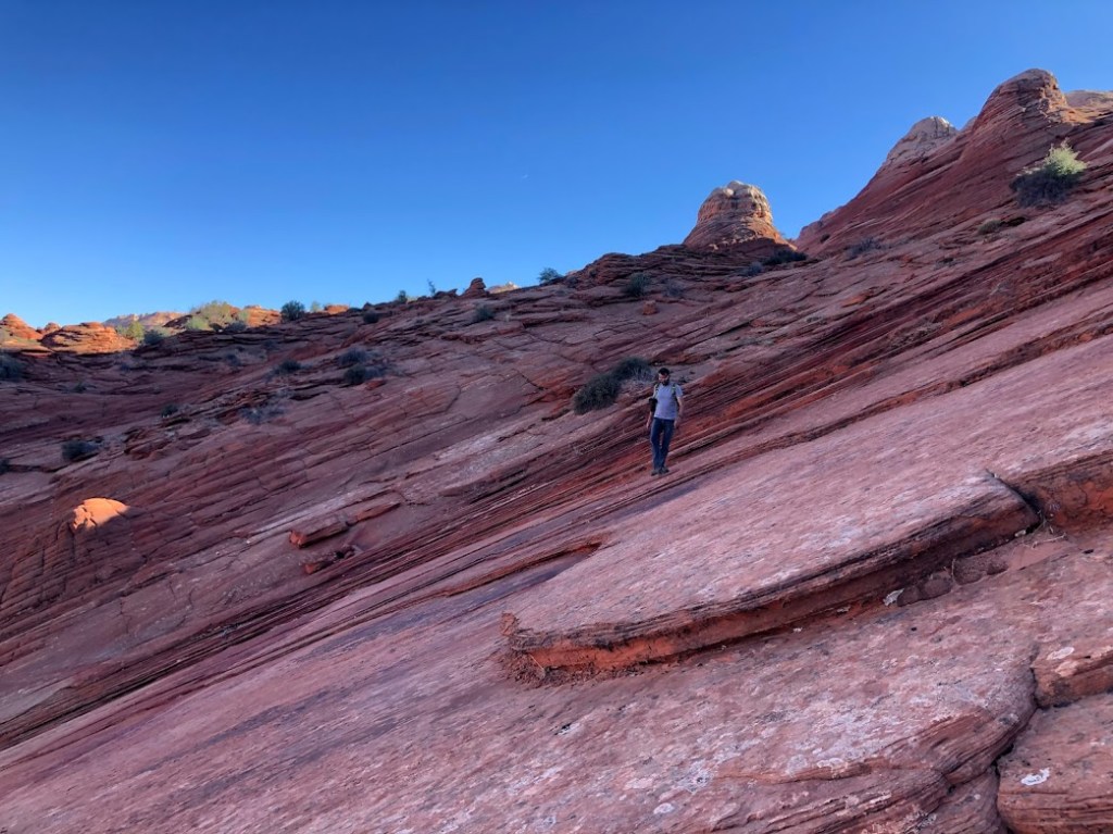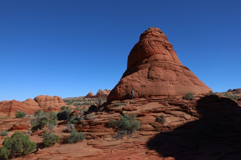 I say “trek,” not “hike” because there is no formal trail to the Teepees, just a lot of advice from strangers on the internet. We did not get lost – the Teepees are big and very easy to keep in view – but it’s utterly impossible among all these rock formations and canyons to take a direct route to anything. So we wound our carefully up, down, and around crazy sandstone formations, hunting for other people’s footprints. This is tough when most of the ground is covered in bare rock.