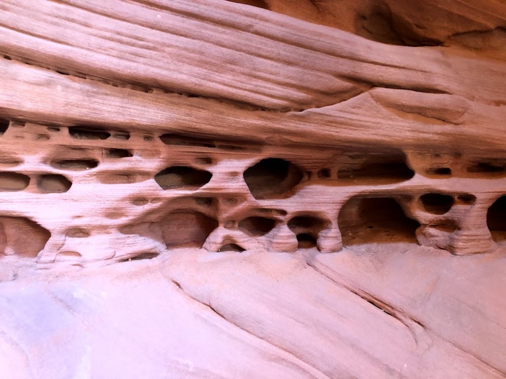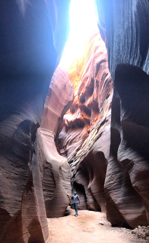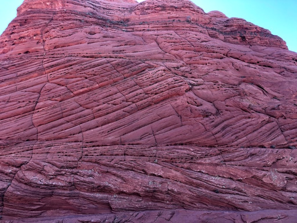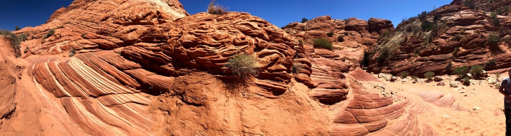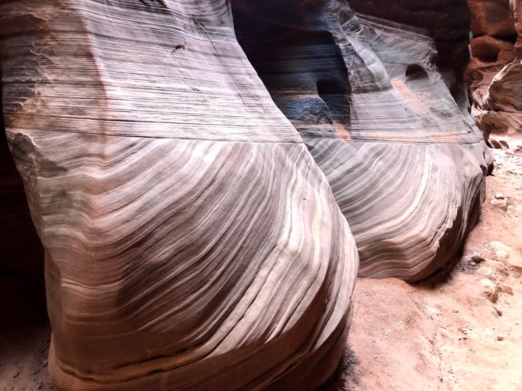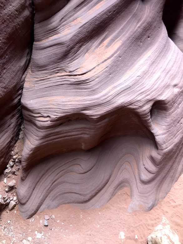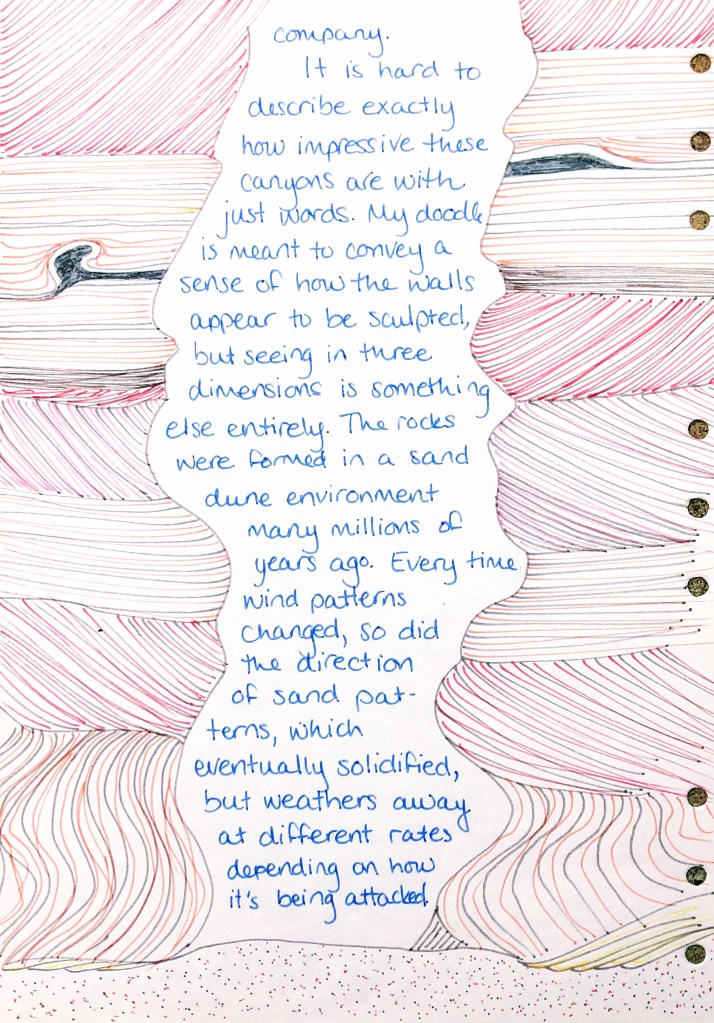 [Like the Wave,] The Wire is also a wildly popular hike, though in this case there are no restrictions on how many people can go on a given day. The trail winds back through a series of slot canyons (canyons with very narrow access) that become more and more impressive the farther you go. Happily, the farther you go, the fewer people keep you company. It is hard to describe exactly how impressive these canyons are with just words. My doodle is meant to convey a sense of how the walls appear to be sculpted, but seeing it in three dimensions is something else entirely. The rocks were formed in a sand dune environment many millions of years ago. Every time wind patterns changed, so did the direction of sand patterns, which eventually solidified, but which weathers away at different rates depending on how it’s being attacked.