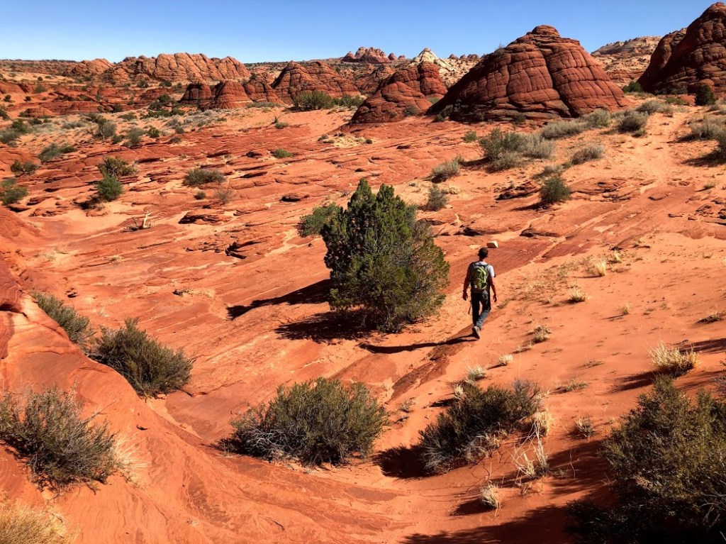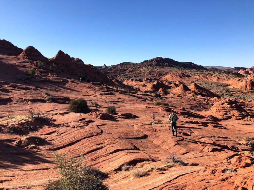 We had meant to cut south while on this trail to head for the Teepees, a colorfully-banded, cone-shaped set of formations made from the same deposits that make the Wave so beautiful, but it turns out you can’t just cut out of a canyon with 200-foot walls. So we retraced our steps for 2.5 miles to where the Teepees trek more officially begins.