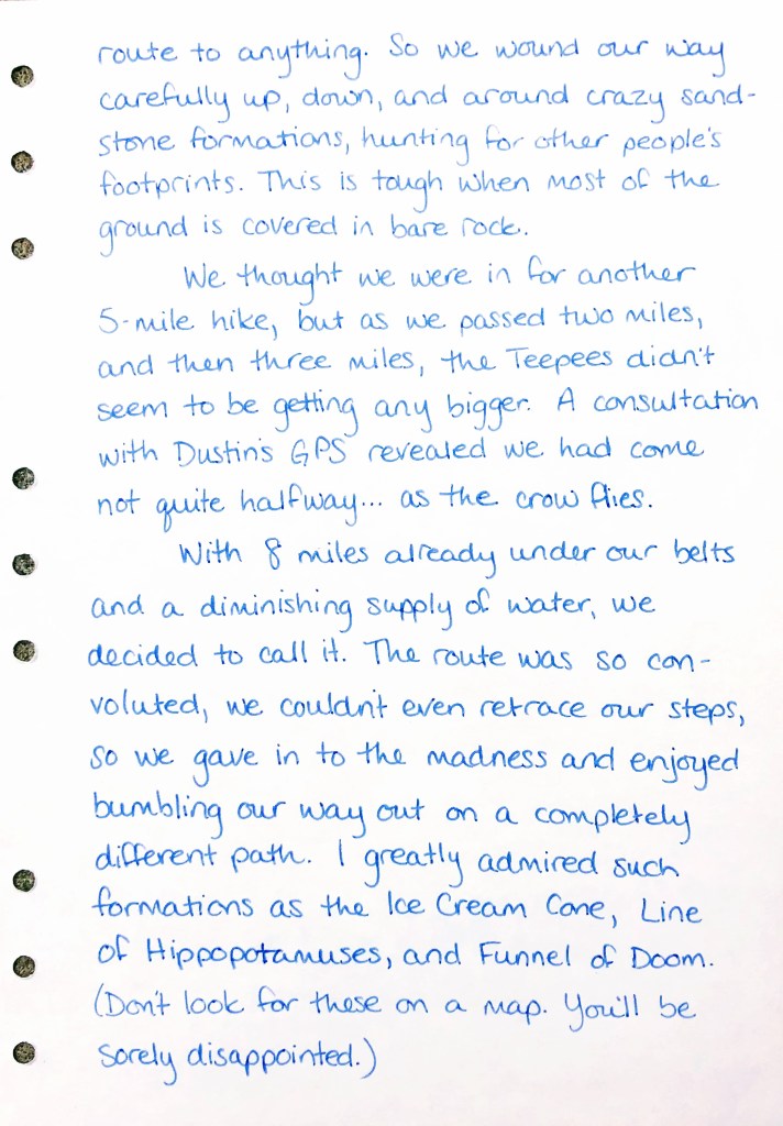 With 8 miles already under our belts and a diminishing supply of water, we decided to call it. The route was so convoluted, we couldn’t even retrace our steps, so we gave in to the madness and enjoyed bumbling our way out on a completely different path. I greatly admired such formations as the Ice Cream Cone, Line of Hippopotamuses, and Funnel of Doom. (Don’t look for these on a map. You’ll be sorely disappointed [when you discover I invented all those names].)