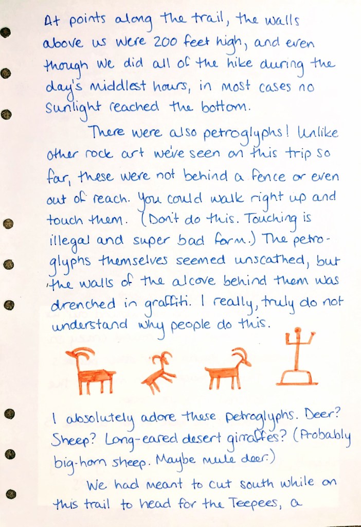 There were also petroglyphs! Unlike other rock art we’ve seen on this trip so far, these were not behind a fence or even out of reach. You could walk right up and touch them. (Don’t do this. Touching is illegal and super bad form.) The petroglyphs themselves seemed unscathed, but the walls of the alcove behind them was drenched in graffiti. I really, truly do not understand why people do this.