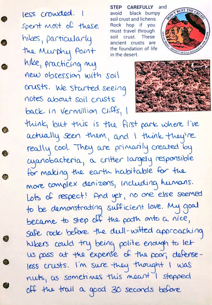 Uplift Dome (probably the site of an ancient meteor impact) and Murphy Point were not deserted, but they were much less crowded. I spent most of these hikes, particularly the Murphy Point hike, practicing my new obsession with soil crusts. We started seeing notes about soil crusts back in Vermillion Cliffs, I think, but this is the first park where I’ve actually seen them, and I think they’re really cool. They are primarily created by cyanobacteria, a critter largely responsible for making the earth habitable for the more complex denizens, including humans. Lots of respect! And yet, no one else seemed to be demonstrating sufficient love. My goal became to step off the path onto a nice, safe rock before the dull-witted approaching hikers could try being polite enough to let us pass at the expense of the poor, defenseless crusts. I’m sure [the other hikers] thought I was nuts, as sometimes this meant I stepped off the trail a good 30 seconds before our paths actually crossed. Whatever. Save the crusts!!
