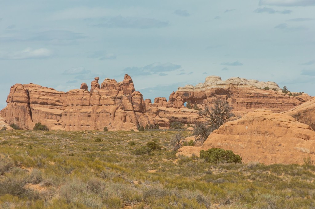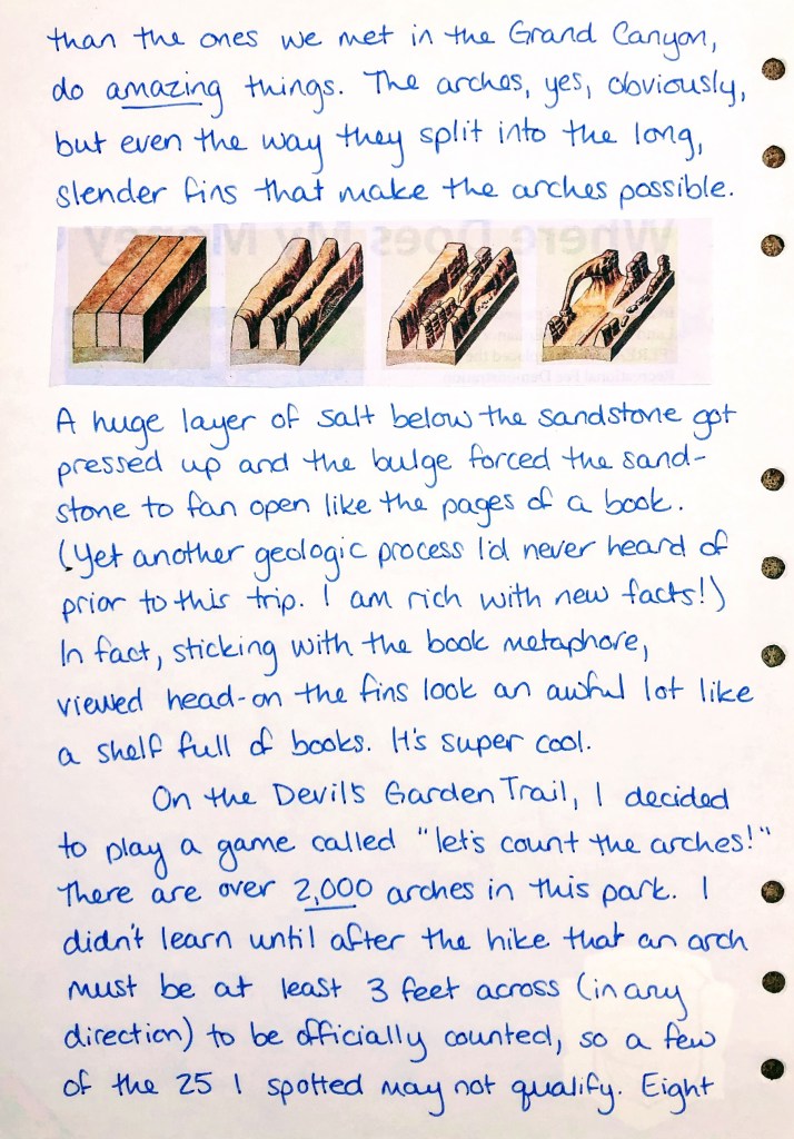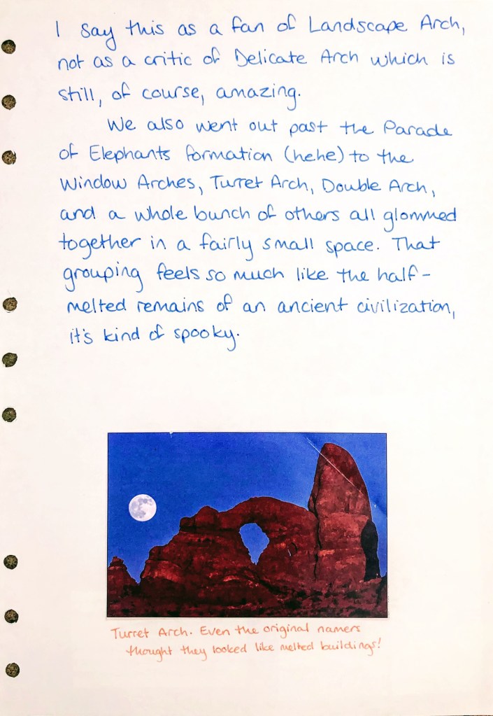 These rocks, so very much younger than the ones we met in the Grand Canyon, do amazing things. [They create] arches, yes, obviously, but even the way they split into the long, slender fins that make the arches possible [is amazing]. A huge layer of salt below the sandstone got pressed up and the bulge forced the sandstone to fan open like the pages of a book. (Yet another geologic process I’d never heard of prior to this trip. I am rich with new facts!) In fact, sticking with the book metaphor, viewed head-on the fins look an awful lot like a shelf full of books. It’s super cool.