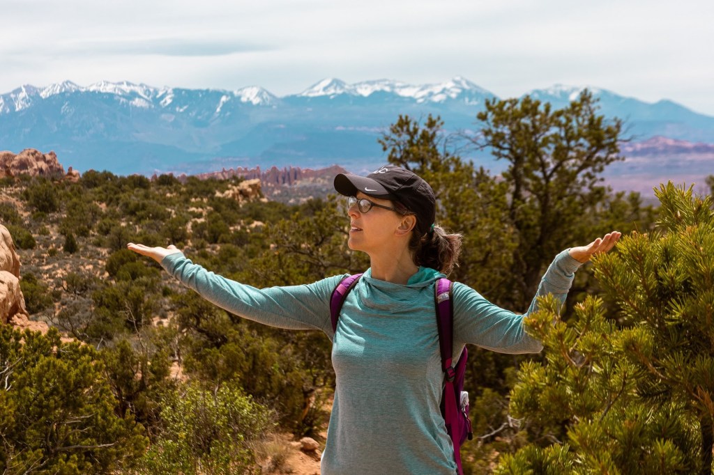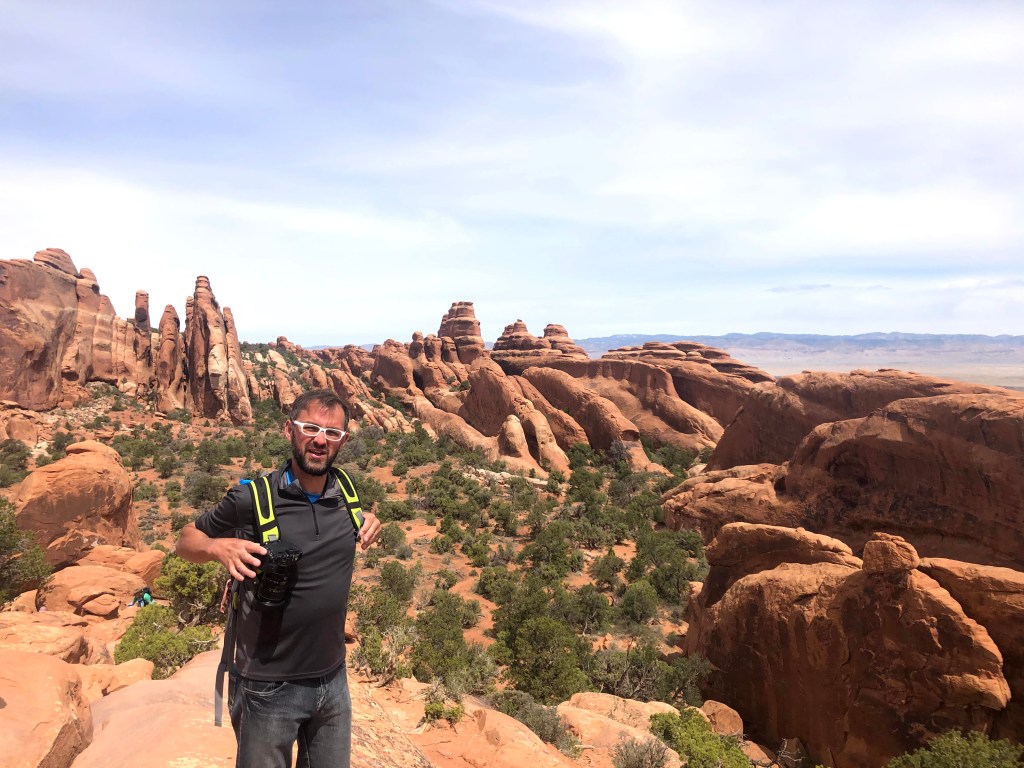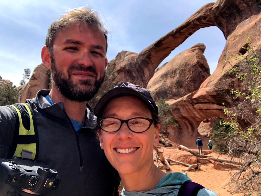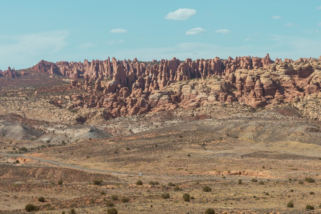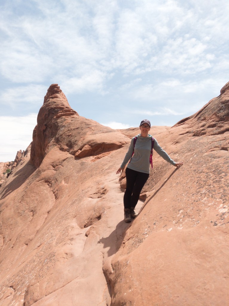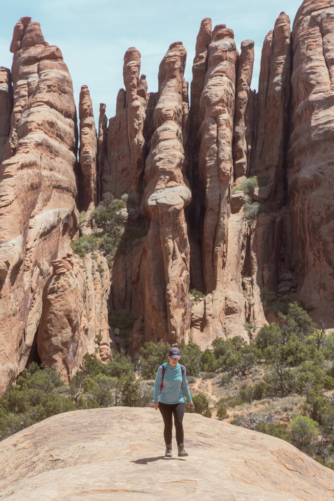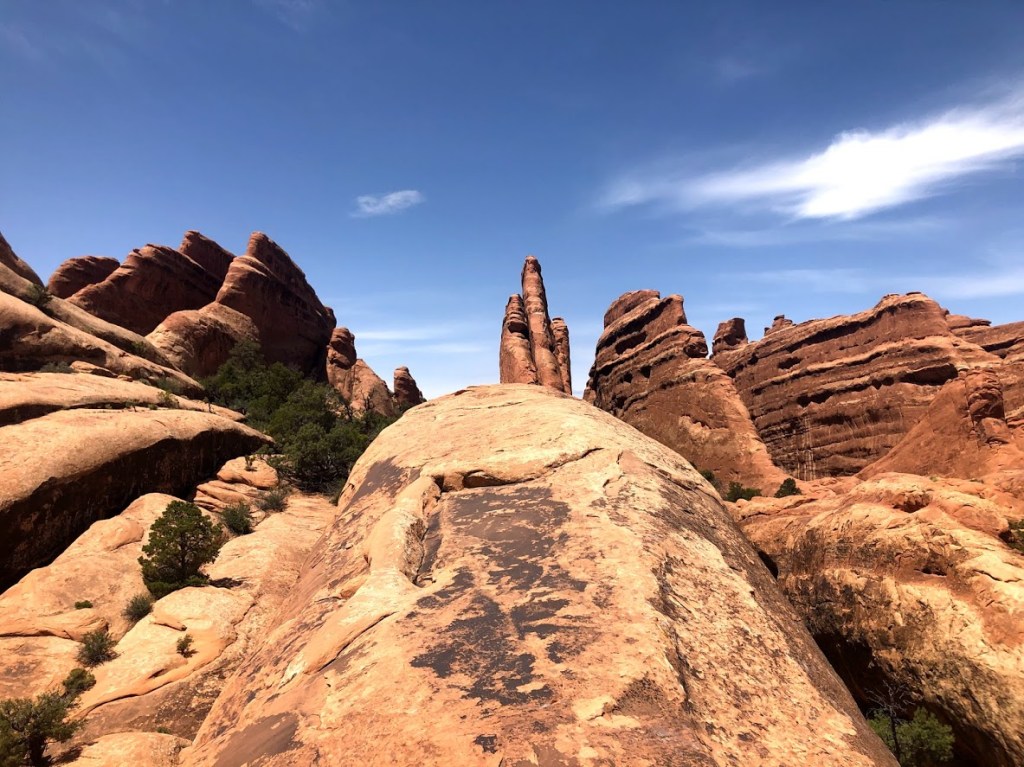 We arrived early but not quite early enough in Utah’s most iconic park. Pulling up at 8:05, we still wound up waiting about 20 minutes to get in through the entry gate. We stopped oh-so-briefly at the visitor’s center before heading all the way to the Devil’s Garden trailhead at the end of the scenic drive. We thought that by doing that first, skipping the more obvious stops at Balanced Rock and Delicate Arch, we might beat the crowds. Haha. We drove around the huge parking lot 6 times before we got lucky and found someone pulling out.