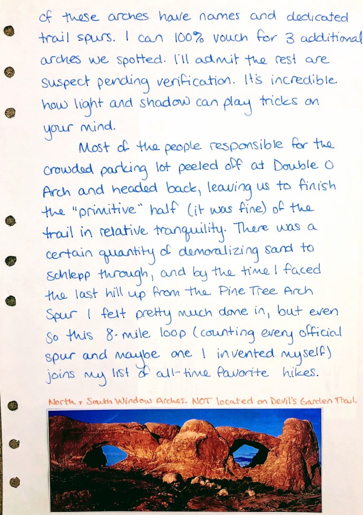 Most of the people responsible for the crowded parking lot peeled off at Double O Arch and headed back, leaving us to finish the “primitive” half of the trail (it was fine) in relative tranquility. There was a certain quantity of demoralizing sand to schlepp through, and by the time I faced the last hill up from the Pine Tree Arch Spur I felt pretty much done in, but even so, this 8-mile loop (counting every official spur and maybe one I invented myself) joins my list of all-time favorite hikes.