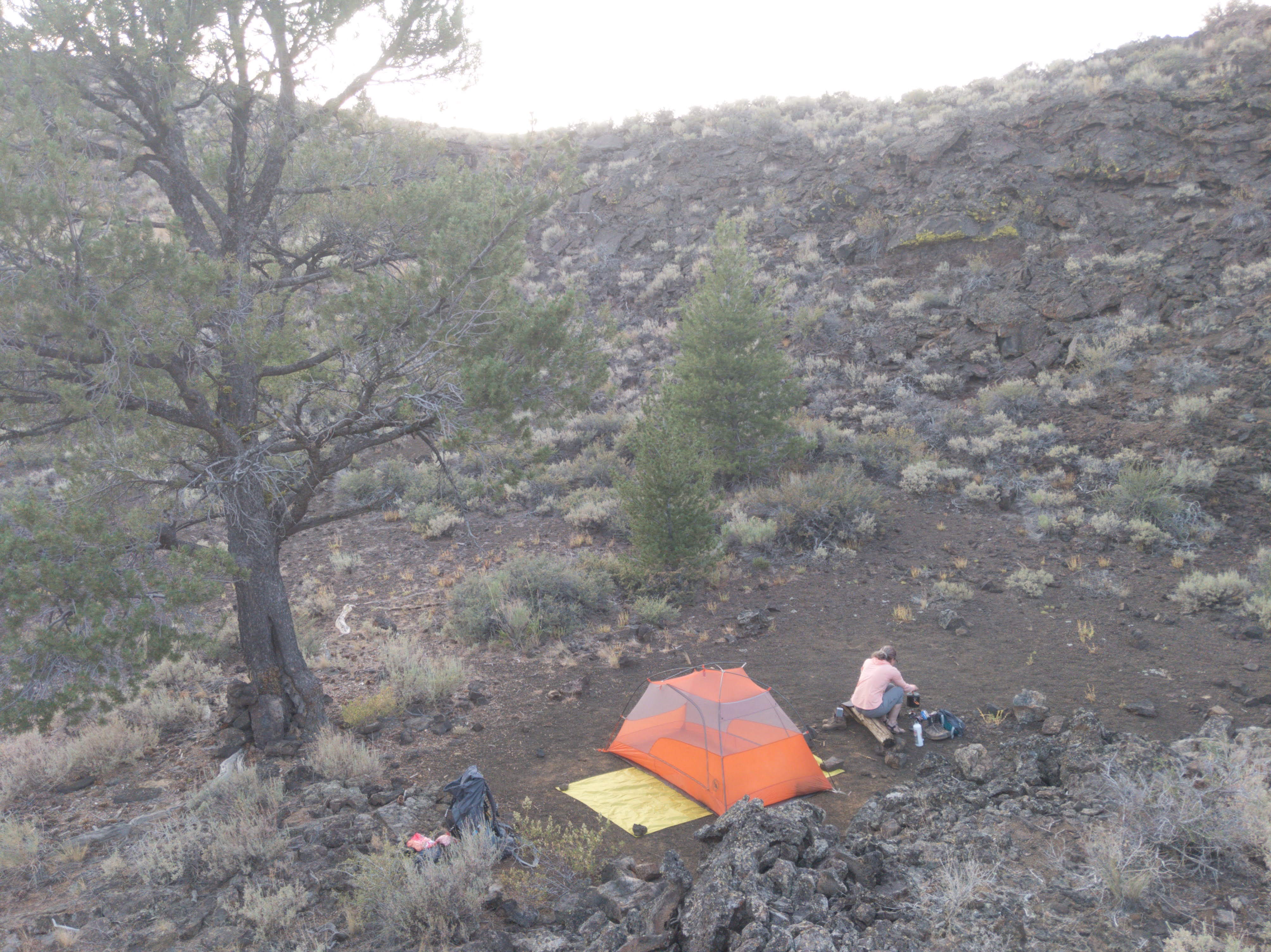 Onward, then, to Craters of the Moon National Monument! When I learned how few permits are requested to camp in the wilderness here, I immediately put camping on the agenda. Armed with our rare permit and serious sun protection, we started by visiting all the cinder cones and half of the caves before heading into the wilderness around 6:30 as the temperature finally started to fall. We camped INSIDE a volcano crater, which is possibly the coolest thing I can say I’ve ever done.