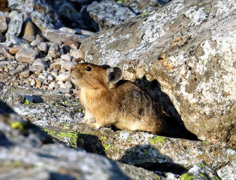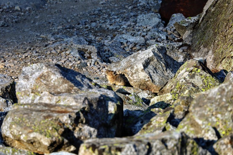 “There!” Dustin said after a moment. He pointed, but it took me a moment to pick out the pika perched on top of a granite boulder about twenty feet away.