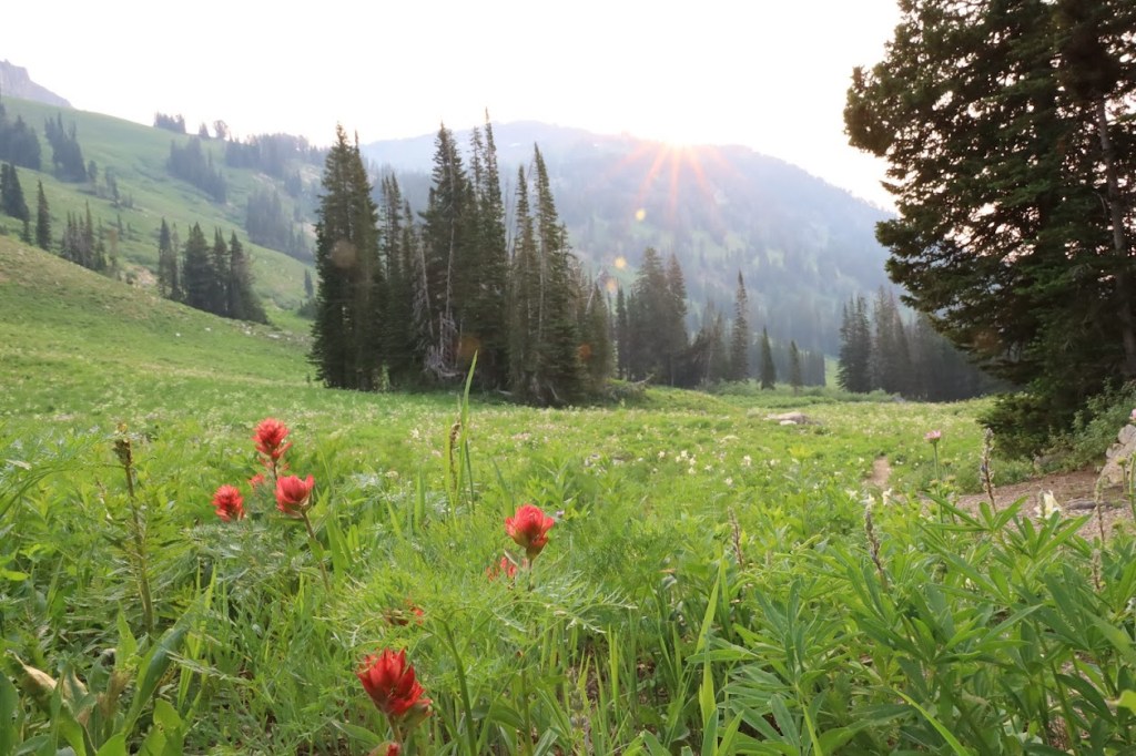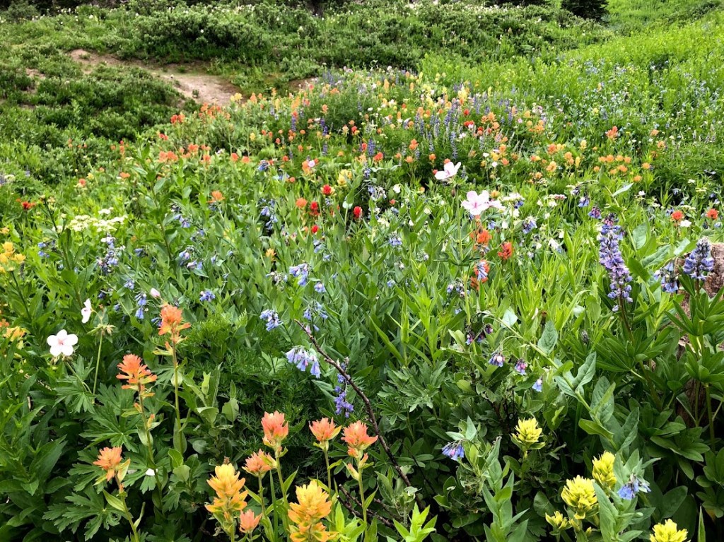 The pain was mitigated by the obscene abundance of wildflowers along our route. I had never seen such wildflowers. The whole world was green speckled with points of red, pink, yellow, white, orange, purple, and blue. Everything grew together in a wild riot of color, the way I my five-year-old self imagined flowers should grow.