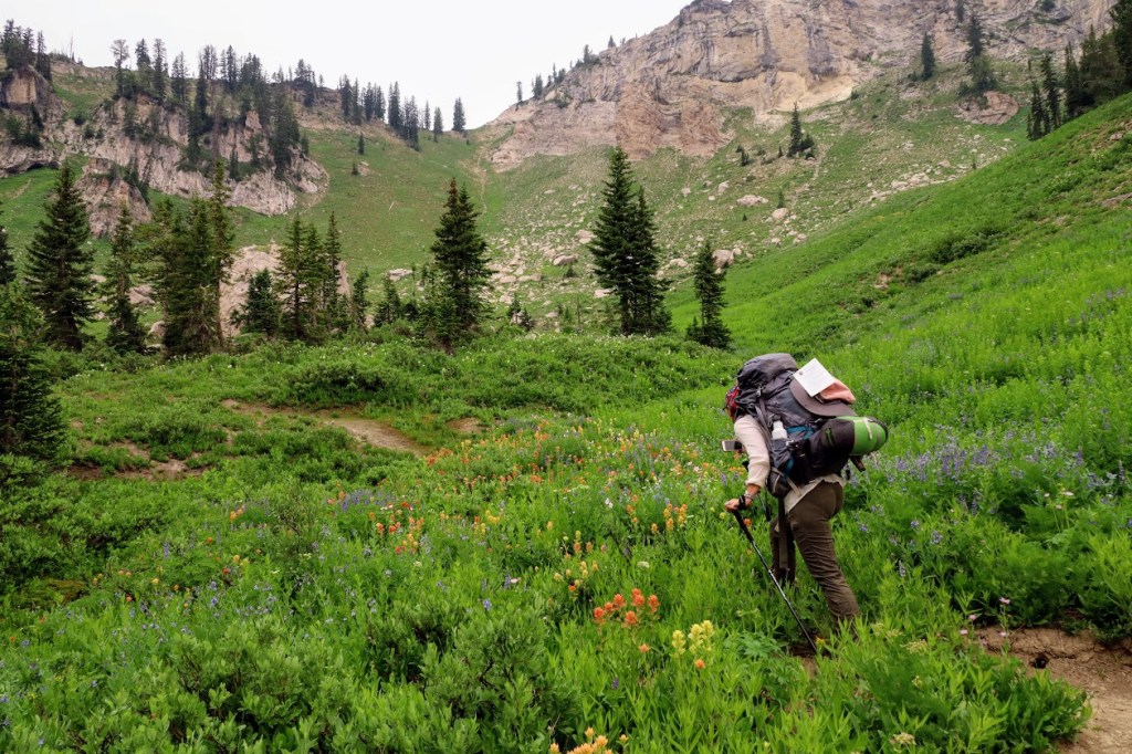 After inspecting a pile of pants someone had abandoned at one of the campsites (and totally rejecting the temptation to pack them out as litter – I had plenty of my own dirty pants, thank you), we discovered that our morning moose had preceded us up the trail. He led the way farther yet up the trail while we tailed him at a very respectful (park-service-approved) distance, until he got annoyed with the lack of privacy and detoured off into the flowers.
