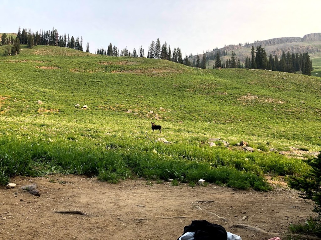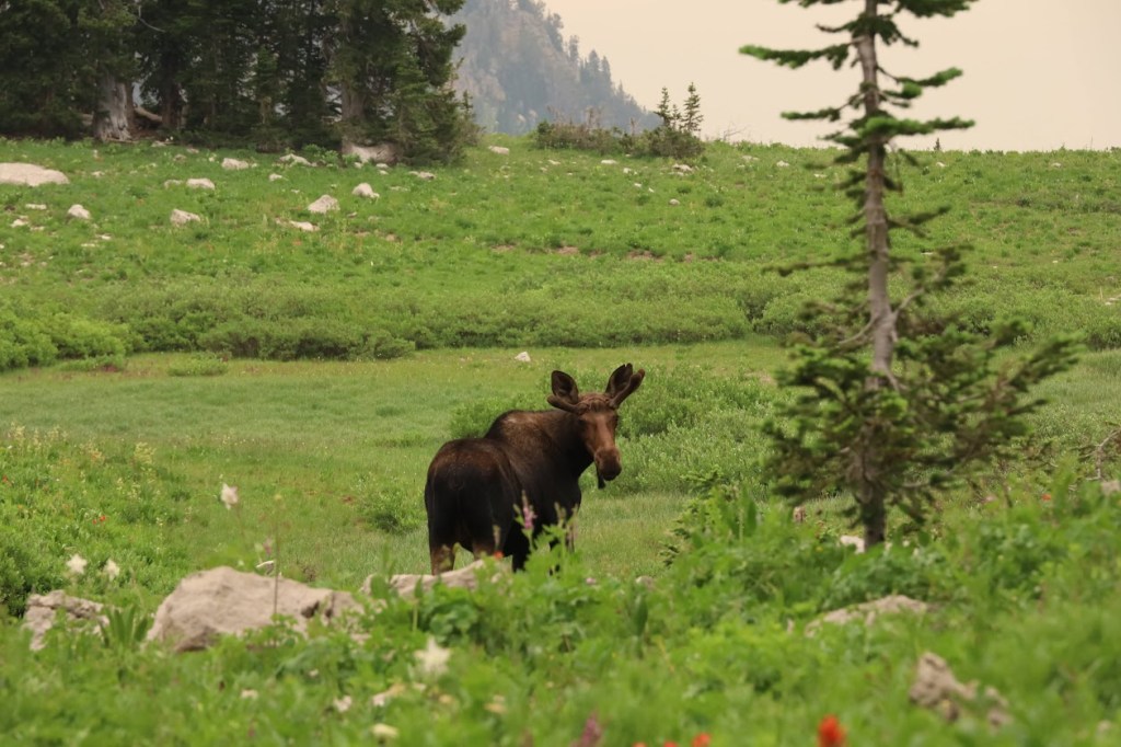 This one was a boy moose with itty-bitty, adorable, fuzzy antlers that looked exactly like a person holding their hands up to their head, thumbs to temples, to impersonate a moose. Unlike the lady who had visited me yesterday morning, this boy definitely took note of us and did not like what he saw. With a solid “harrrummph!” he trotted on up the trail.