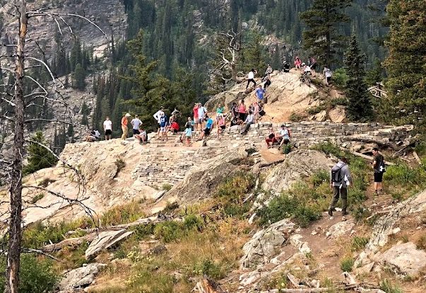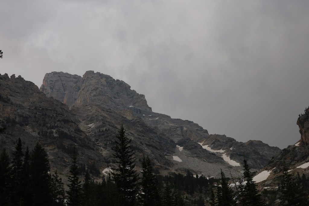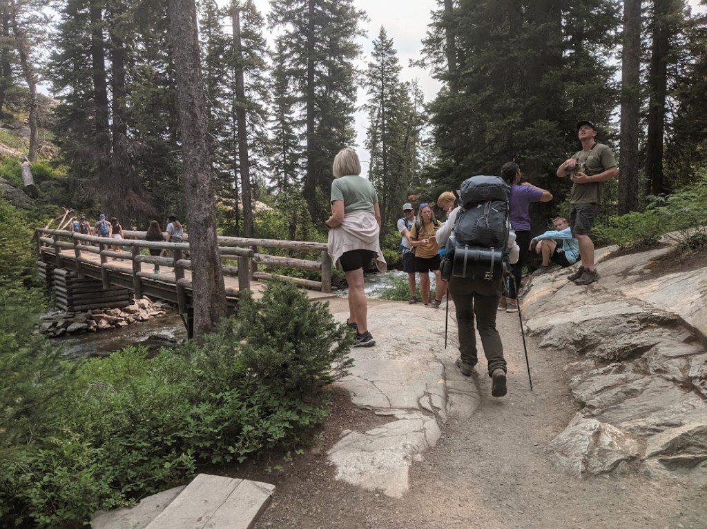 The crowd reached a crescendo at Inspiration Point, a lovely overlook on Jenny Lake. I knew there would be people here, but with a 700-foot elevation gain over a mile, I had not expected quite so many people. Young people, old people, lots of babies. We paused only for the briefest moment to take in the view. The end of our trail was in sight, and the vista, inspiring though it might have been if you hadn’t seen all the things we’d seen in the last four days, could not compete against the crowds and my urge to be done with my backpack forever.
