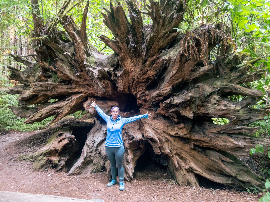 Ladybird Johnson Grove – a good starter grove. Impressive, but just wait until you see what comes next. Find Dustin!Photos cannot convey how tall these things are. Look, I told you this would mostly just be pictures of us staring upward.This is one of my fav photos.They just keep getting bigger…Some days, it’s impossible to know how to dress for the weather, so you just do both. That was inevitable, wasn’t it? (In case yoga isn’t your bag, I’m doing Tree Pose.)Trillium Falls.