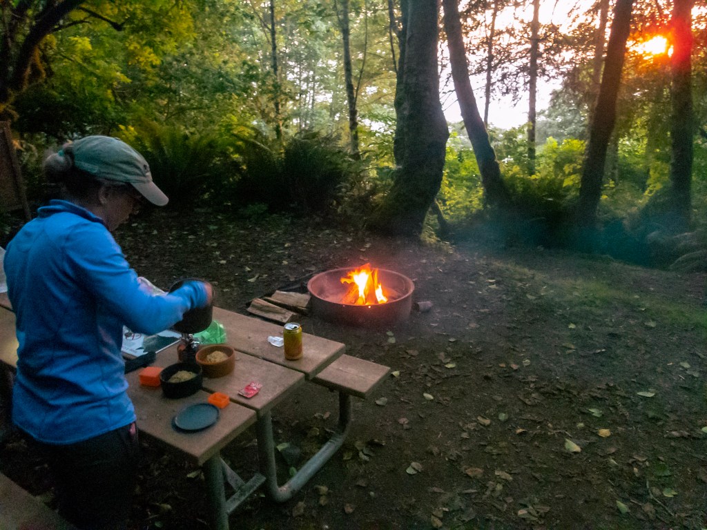 The above photo also depicts the creation of the ab-ramen-ation we had for dinner. We meant to cook up something more elaborate, given the proximity of the car and its cooler full of ice, but we never did manage to find a grocery store, so we made do. Two packets of ramen noodles, six packets of dried ramen vegetables, three mix’n’match packets of ramen seasoning, and an extra sprinkling of sesame seeds for good measure. It was SPICY. At least there was beer.