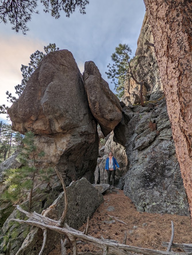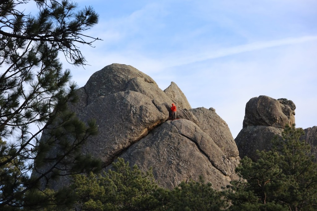 The Mount Baldy Trail (also called Old Baldy Mountain Trail, just to keep things good and confusing) starts at the Wrinkled Rock Climbing Area pullout off Highway 244, just past Mount Rushmore. As the name suggests, it’s a very popular spot for climbers, and the parking lot can get full on nice days, so consider an early start. Even at the end of November, half the parking lot was full.