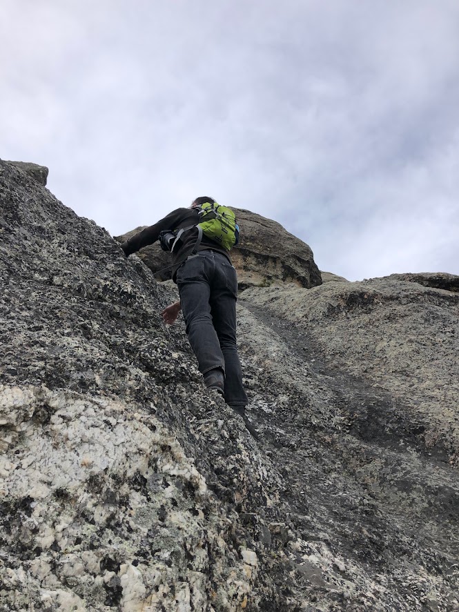 After a reasonable bit of scrambling, we arrived on this lovely flat area feeling like mice who had just solved a maze. We didn’t know it at the time, but this flat area was the last moment of calm we would have on this hike (and by “calm” I mean “free of gale-force winds”). Stop and rest here if you need a breather. The views are already pretty spectacular.