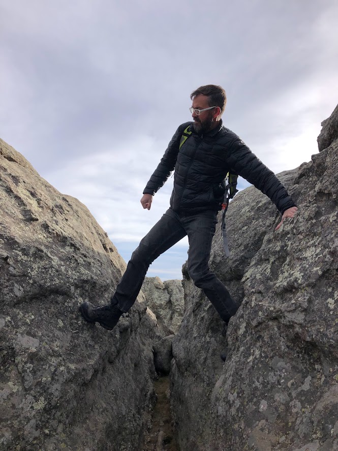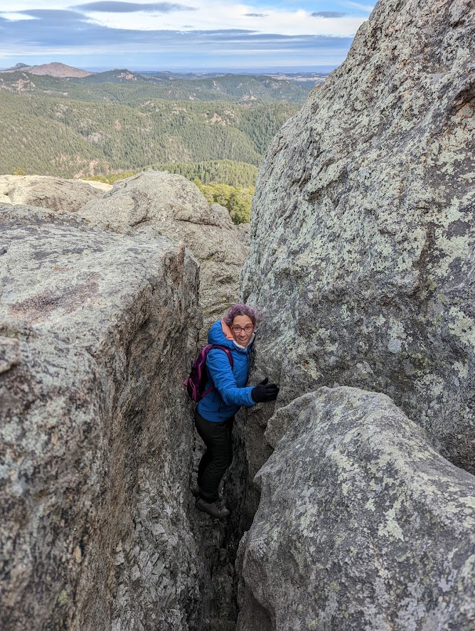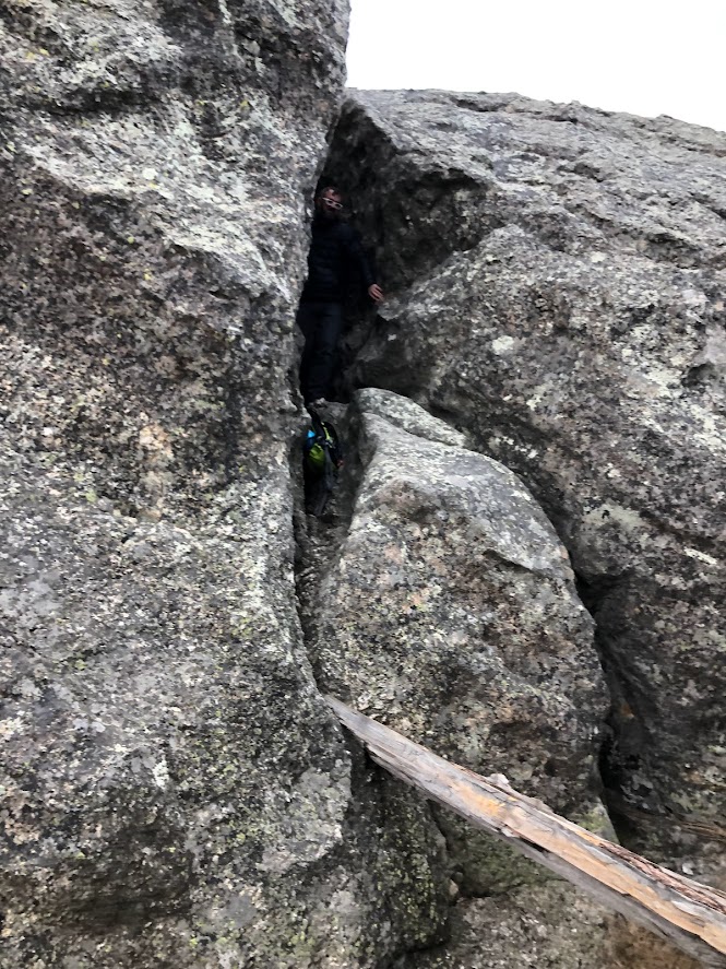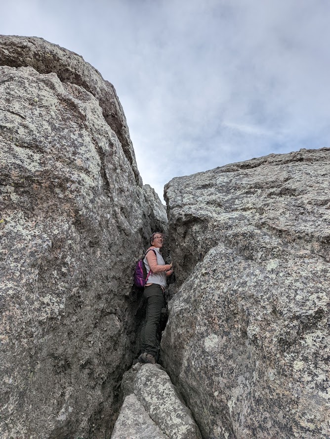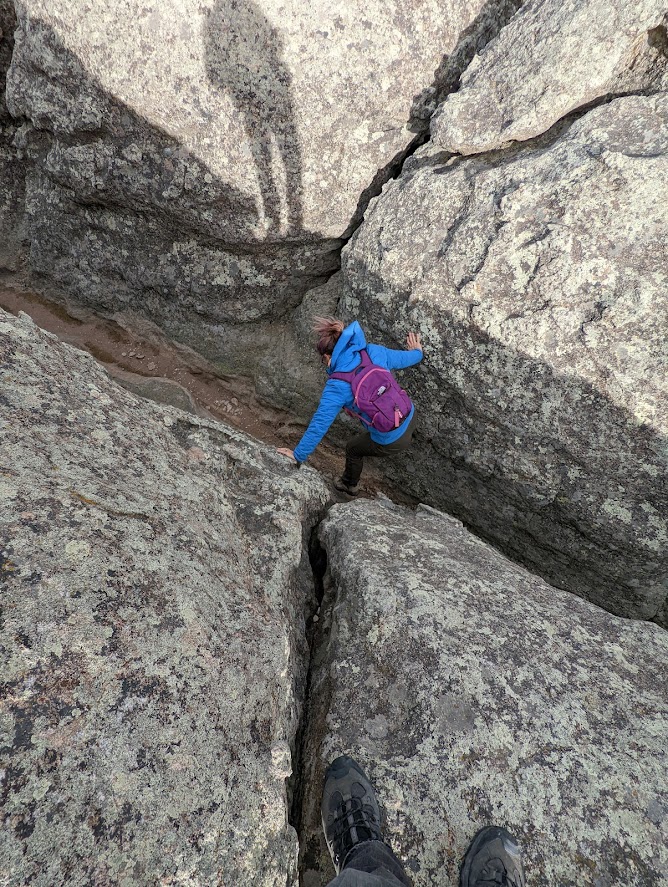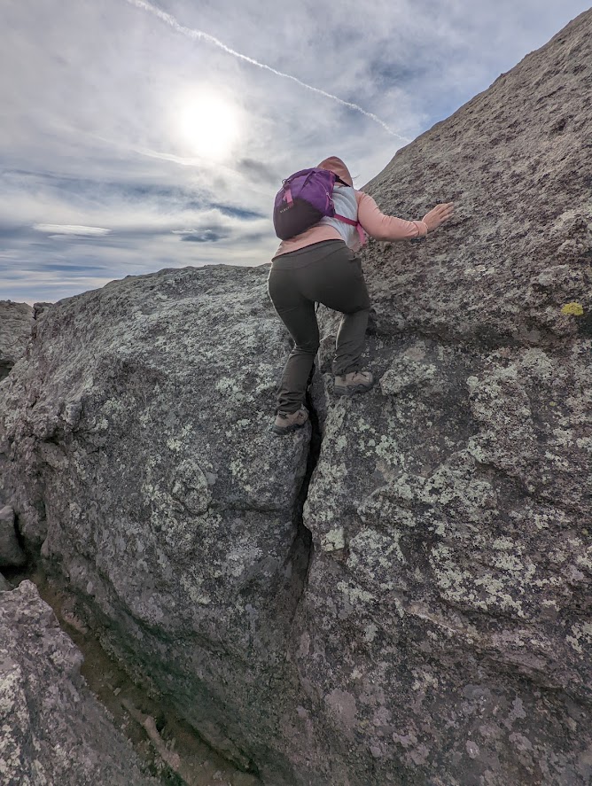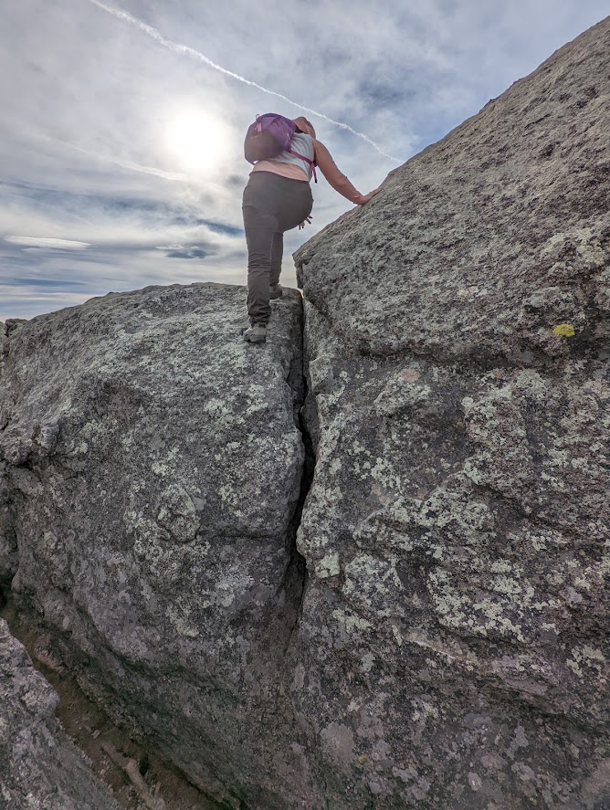 Victoriously emerging from the crack! But there are more rocks to go. From here, it’s mostly picking your way carefully over the uneven boulder surfaces, but if you want to make it to the very bald top, there’s at least one more bit of climbing to navigate.