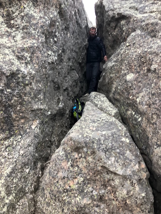 There’s a crack in this rock. It isn’t a very big crack, but it was big enough for me in my daypack and for my 6’3″ husband after he took his daypack off. Larger hikers or anyone who suffers from serious claustrophobia might need to see about picking a route over these rocks instead of through them. I, myself, am strange and unusual mildly claustrophobic, but managed to navigate the squeeze without any serious pangs.
