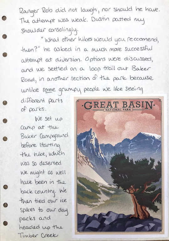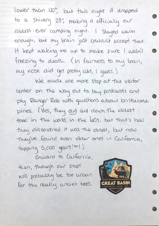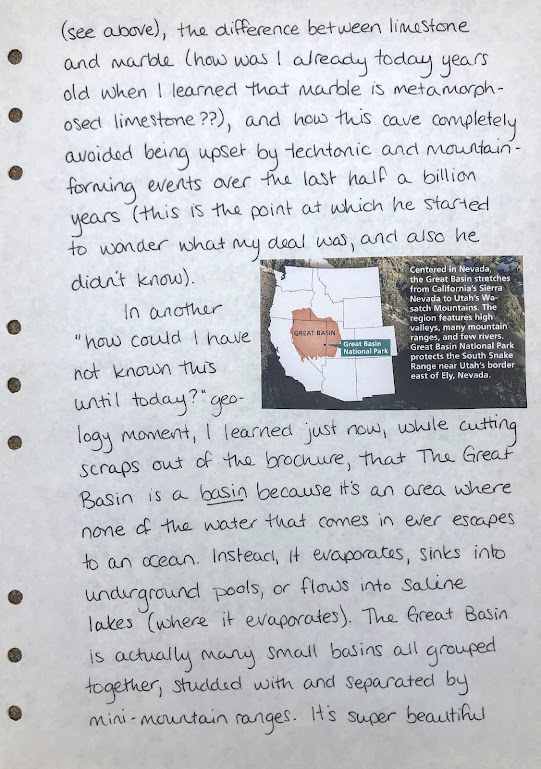 In another “how could I have not known this until today?” geology moment, I learned just now, while cutting scraps out of the brochure, that The Great Basin is a basin because it’s an area where none of the water that comes in ever escapes to an ocean. Instead, it evaporates, sinks into underground pools, or flows into saline lakes (where it evaporates). The Great Basin is actually many small basins all grouped together, studded with and separated by mini-mountain ranges. It’s super beautiful and varied, leading us back to the surprise I initially expressed in this entry.