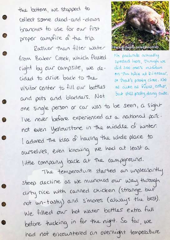 Rather than filter water from Baker Creek, which flowed right by our campsite, we decided to drive back to the visitor center to fill our bottles, pots, and bladders. Not one single person or car was to be seen, a sight I’ve never before experienced at a national park, not even Yellowstone in the middle of winter. I adored the idea of having the whole place to ourselves, even knowing we had at least a little company back at the campground.