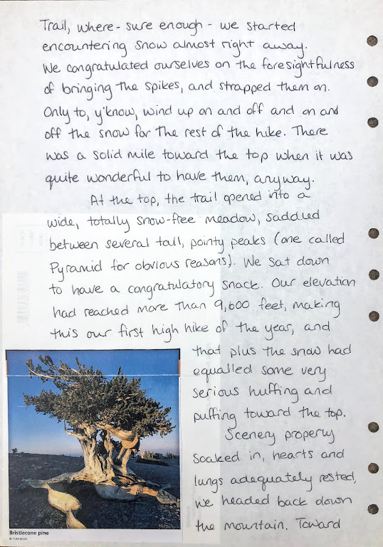 At the top, the trail opened into a wide, totally snow-free meadow, saddled between several tall, pointy peaks (one called Pyramid for obvious reasons). We sat down to have a congratulatory snack. Our elevation had reached more than 9,600 feet, making this our first high hike of the year, and that plus the snow had equaled some very serious huffing and puffing toward the top.