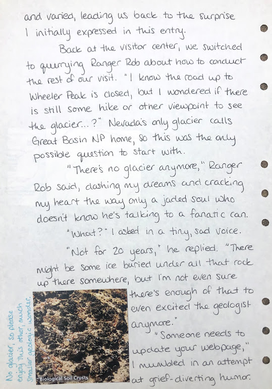 “I know the road up to Wheeler Peak is closed, but I wondered if there is still some hike or other viewpoint to see the glacier… ?” [I asked.] Nevada’s only glacier calls Great Basin NP home, so this was the only possible question to start with.
