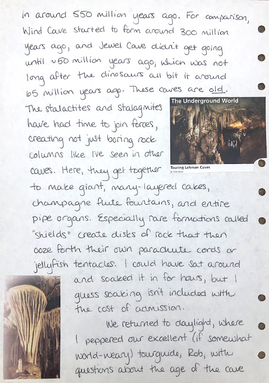 The cave tour was excellent, and the cave itself is freaking magnificent. It’s an old, old cave, with its initial formation period clocking in around 550 million years ago. For comparison, Wind Cave [in South Dakota] started to form around 300 million years ago, and Jewel Cave [also in South Dakota] didn’t get going until around 50 million years ago, which was not long after the dinosaurs all bit it around 65 million years ago. [Lehman] Caves are old. The stalactites and stalagmites have had time to join forces, creating not just boring rock columns like I’ve seen in other caves. Here, they get together to make giant, many-layered cakes, champagne flute fountains, and entire pipe organs. Especially rare formations called “shields” create disks of rock that then ooze forth their own parachute cords or jellyfish tentacles. I could have sat around and soaked it in for hours, but I guess soaking isn’t included with the cost of admission.