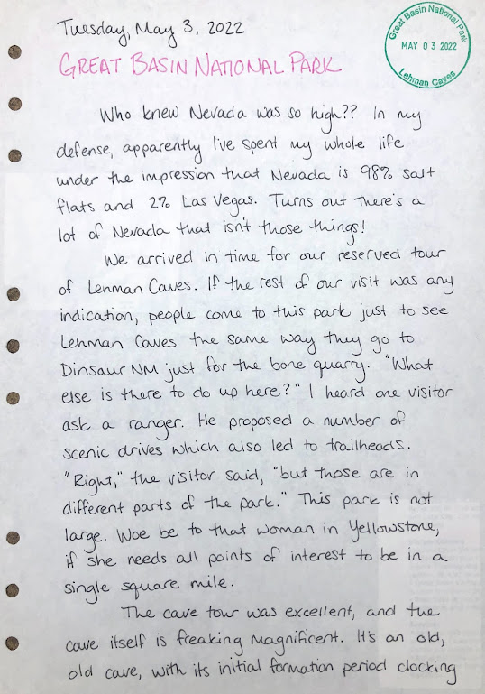 We arrived [in Great Basin] in time for our reserved tour of Lehman Caves. If the rest of our visit was any indication, people come to this park just to see Lehman Caves the same way they go Dinosaur NM just for the bone quarry. “What else is there to do up here?” I heard one visitor ask a ranger. He proposed a number of scenic drives which also led to trailheads.