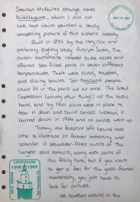 I learned about the Sutro Baths from Seanan McGuire’s strange novel Middlegame, which I did not love but which painted a really compelling picture of this historic oddity. San Francisco.