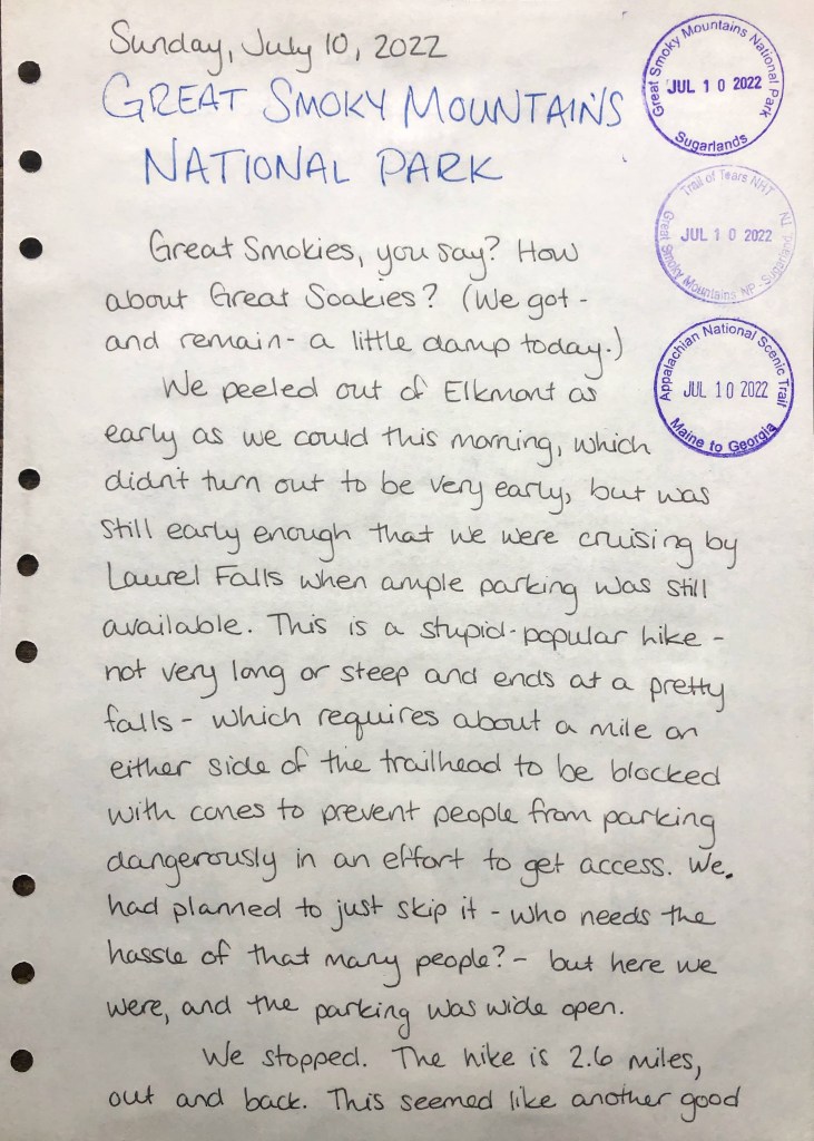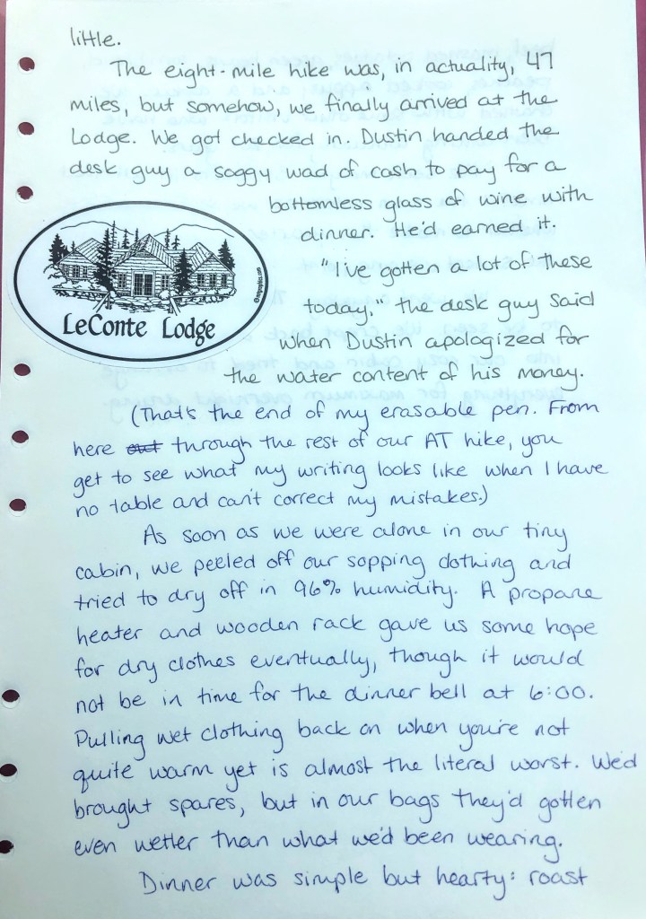 (That’s the end of erasable my pen. From here out through the rest of our AT hike, you get to see what my writing looks like when I have no table to write on and can’t correct my mistakes.)