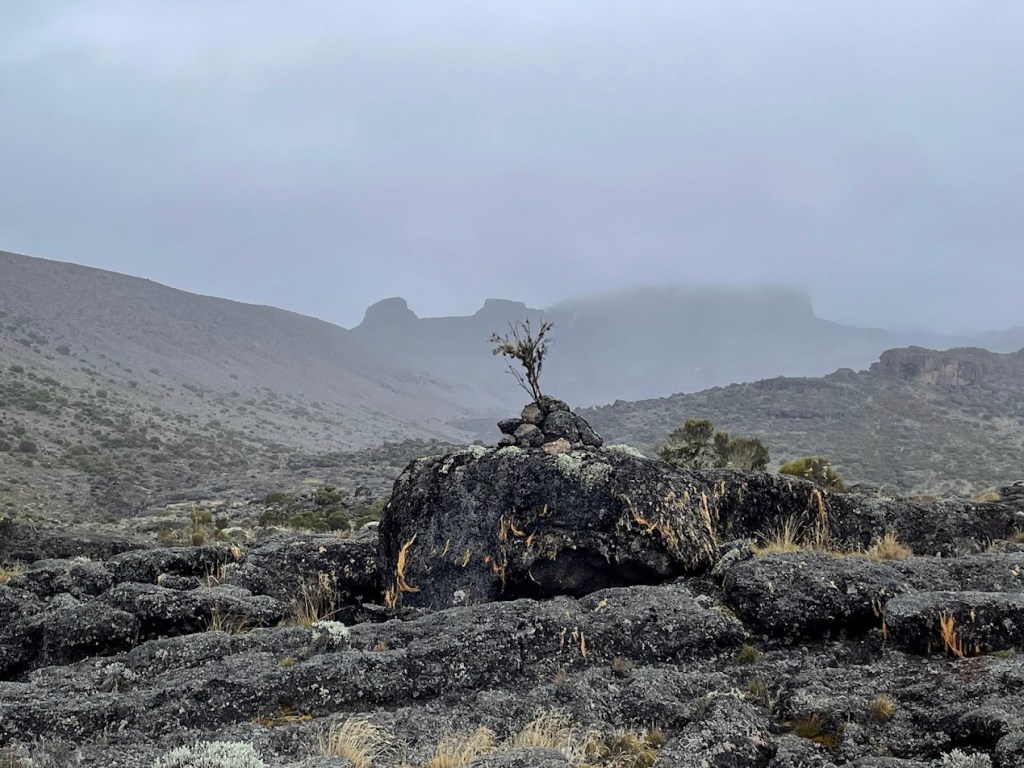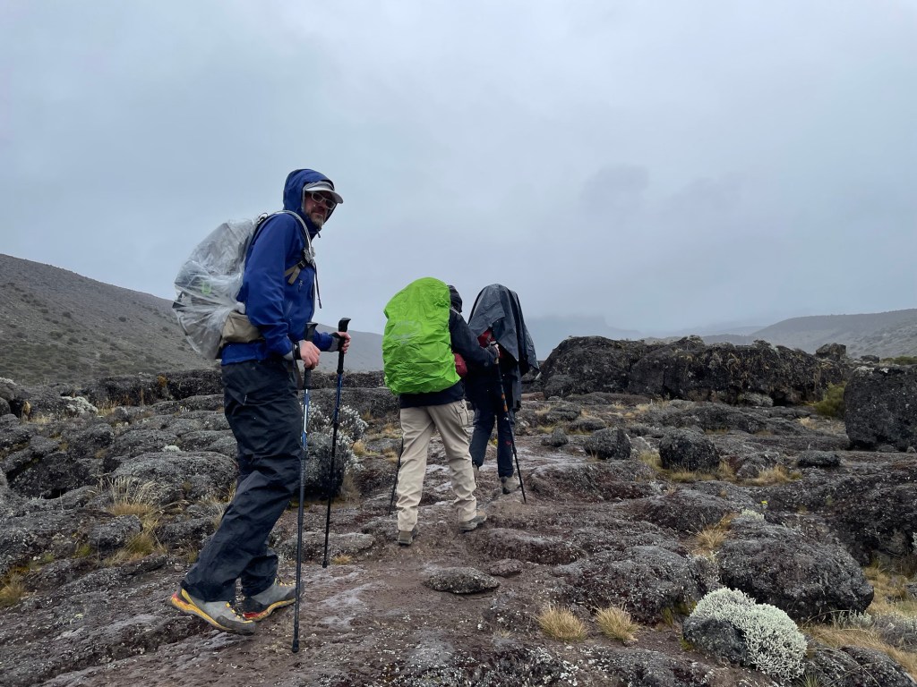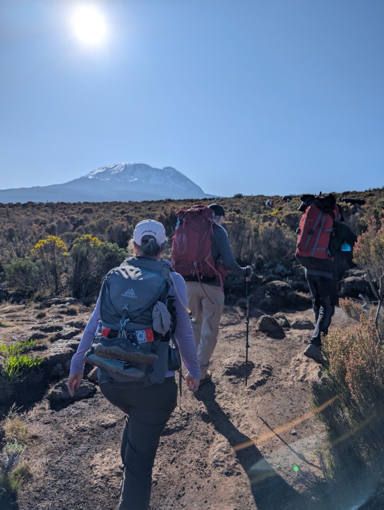 As soon as we left Shira 1 Camp, me moved from the Heather Zone into the Moorland Zone, where the plants became decidedly shrubbier. We no longer hiked under the shading branches of trees, but in the hot sun as Gideon had promised. Layers were shed.